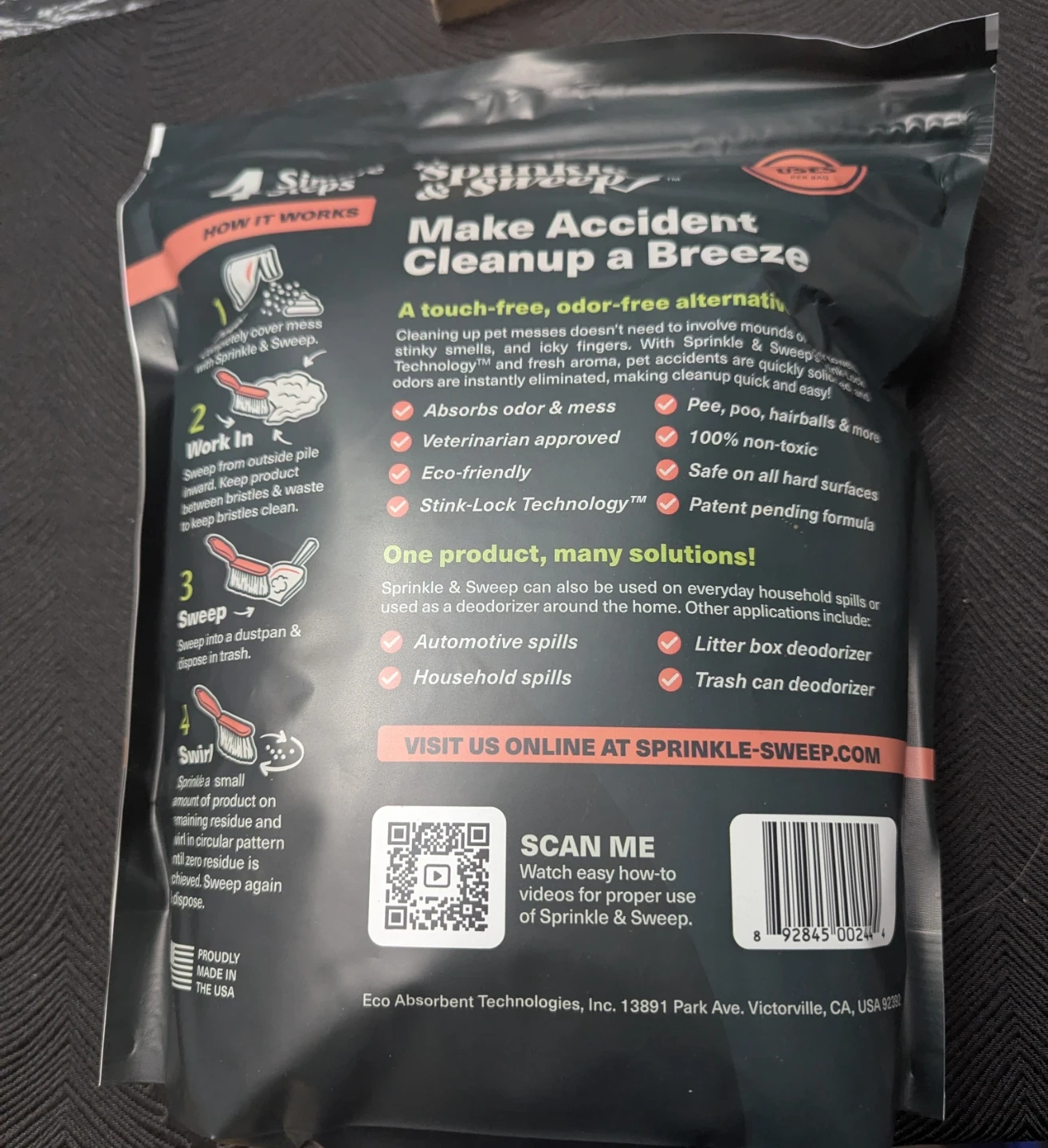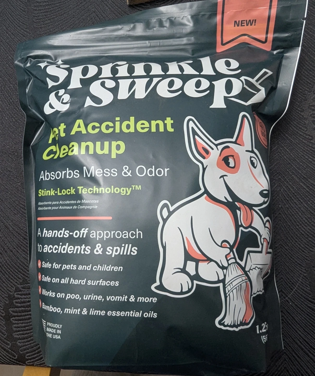 Sprinkle & Sweep makes pet accident cleanup a breeze! It absorbs mess and odour with Stink-Lock Technology™. This product is veterinarian approved, eco-friendly, and safe on all hard surfaces. It works on pet messes and can also be used for household spills.