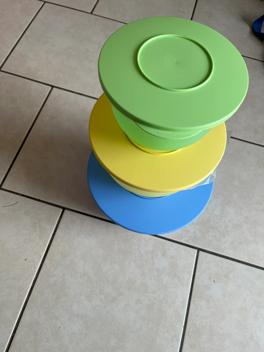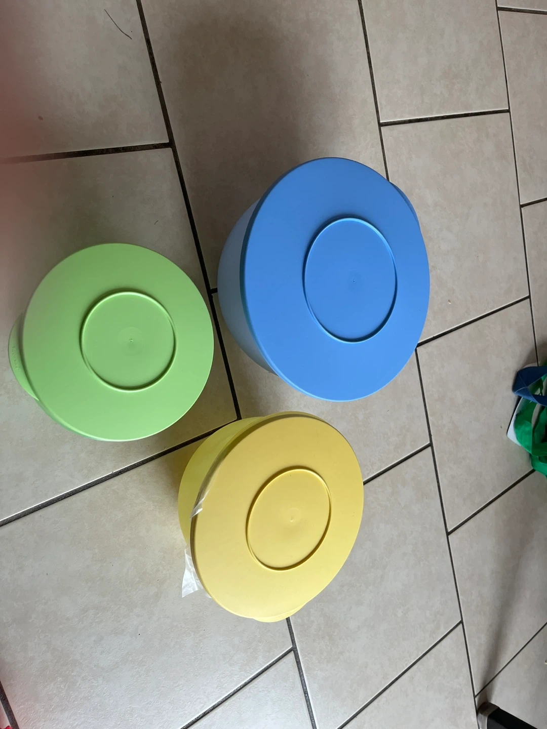 Brand new never use. This is a set of three Tupperware Modular Mates bowls in green, yellow, and blue. They're made of durable plastic and are stackable for easy storage. Use them for leftovers or meal prep!