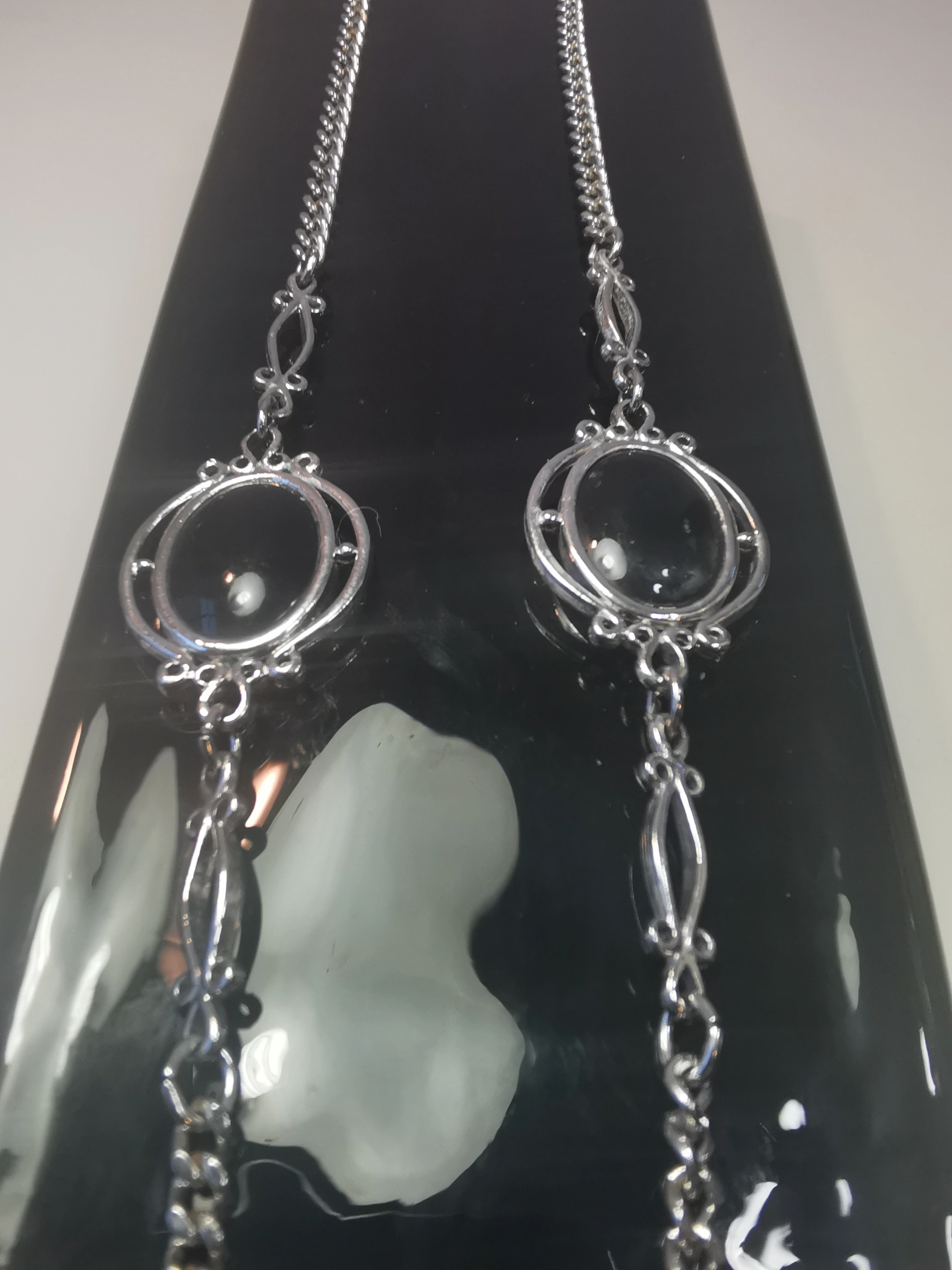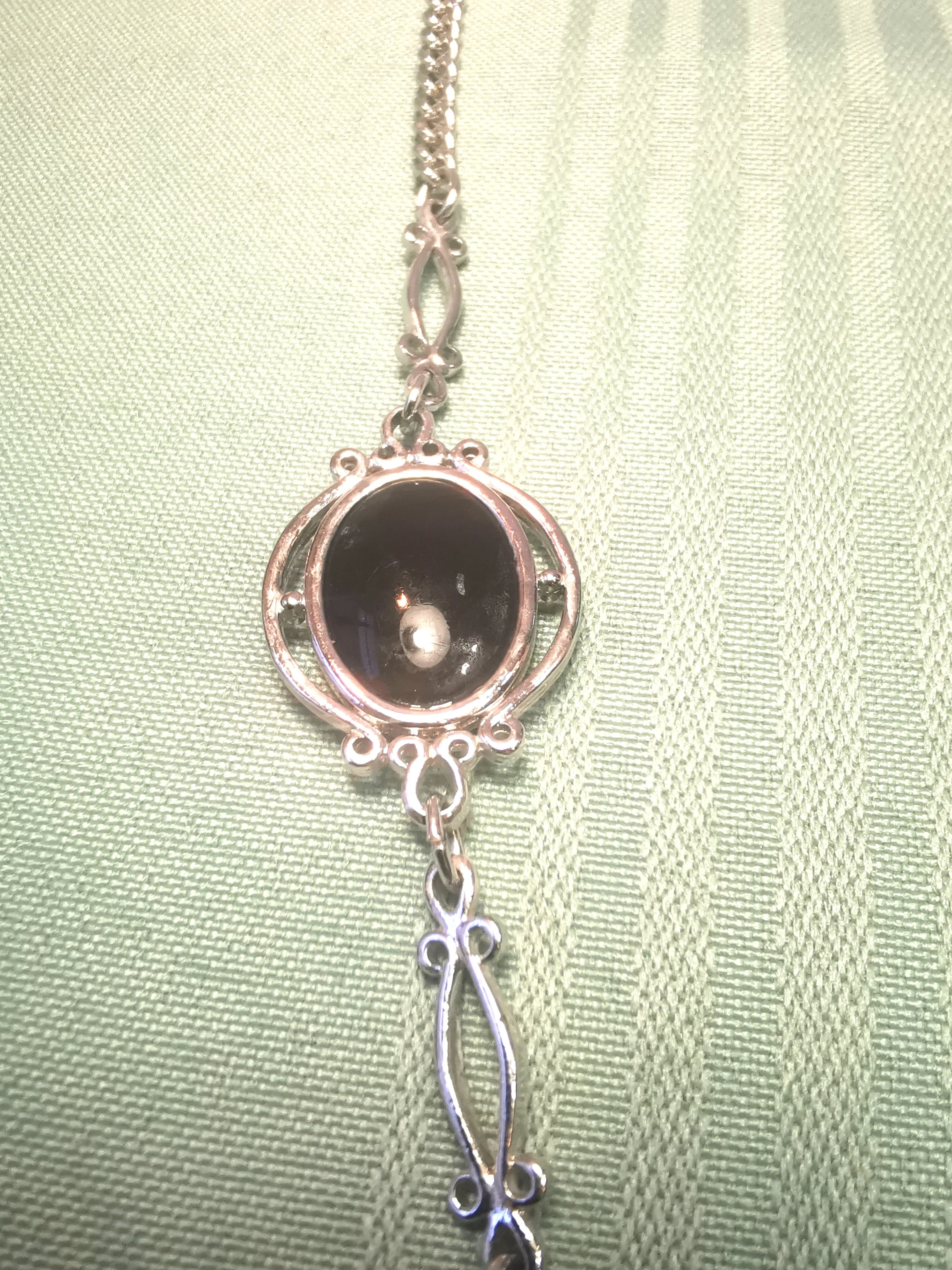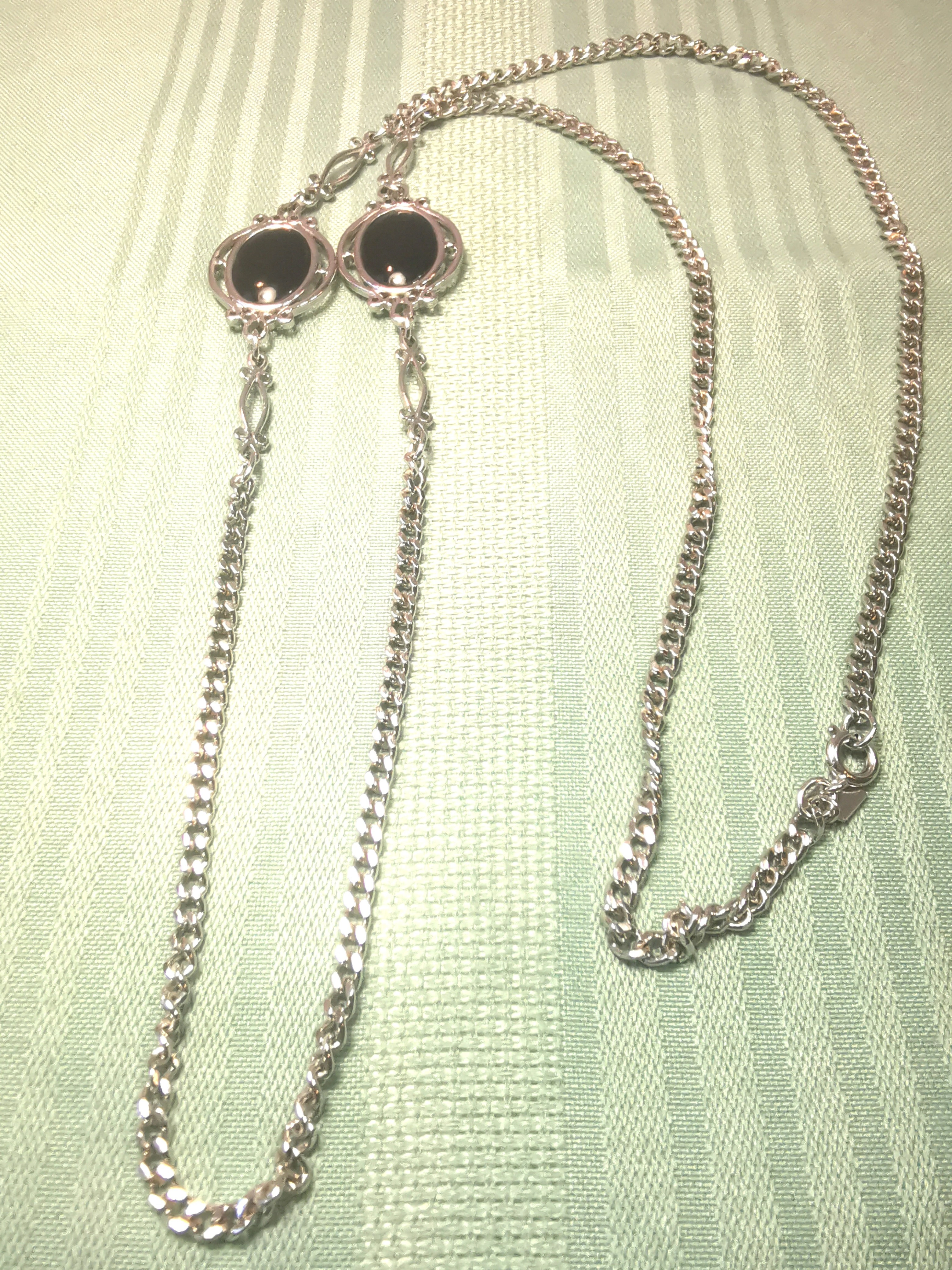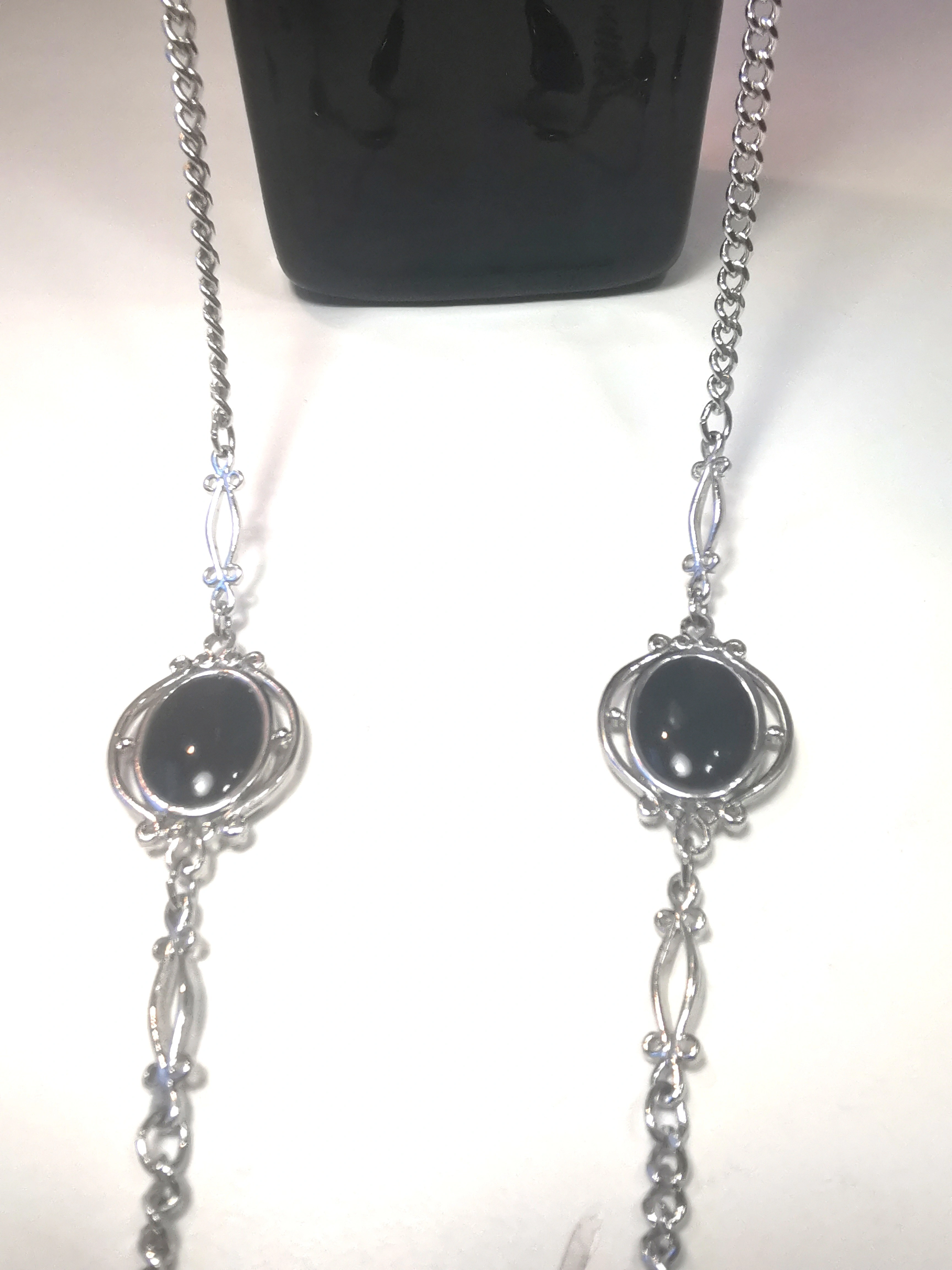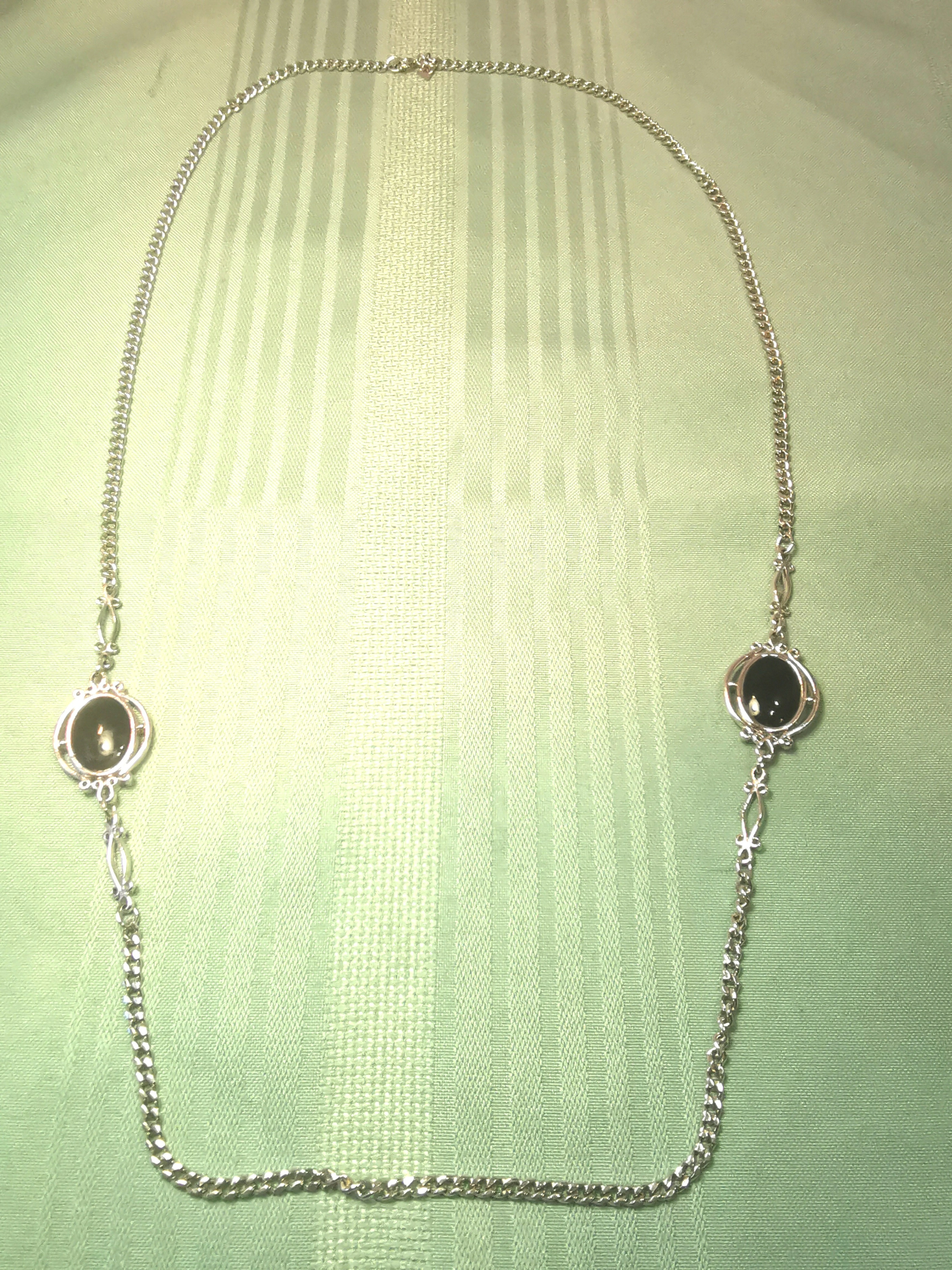 This refined vintage piece is the 1976 "Touch of Class" necklace by Sarah Coventry. It features a brilliant silver-tone specialty chain punctuated by sleek, oval black cabochon "stations." At approximately 33 inches in length, this opera-length piece is designed for versatile styling—it can be worn long for a dramatic silhouette or doubled for a layered look.