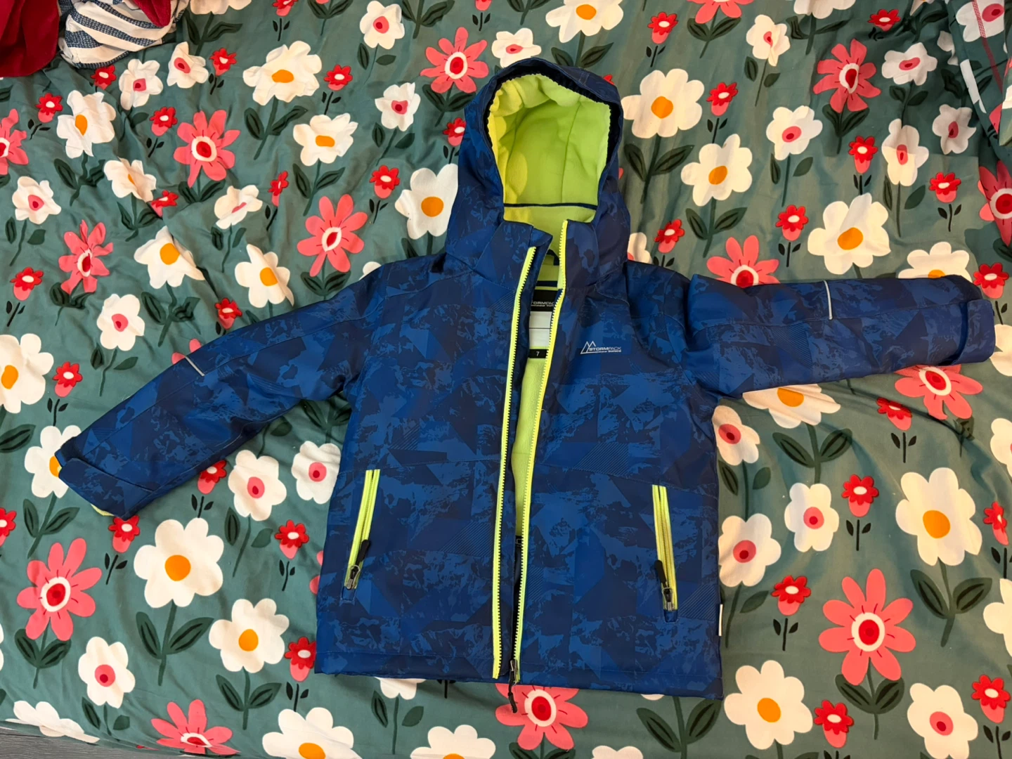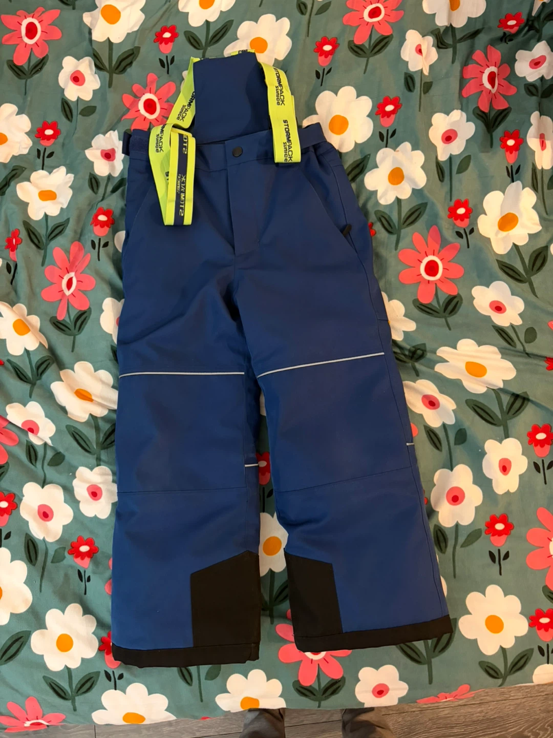 This is a boys' ski jacket and bib pants set by Adventure Force. The jacket is blue with a camouflage-like pattern and neon yellow accents. The bib pants are solid blue with neon yellow suspenders. They're perfect for hitting the slopes!