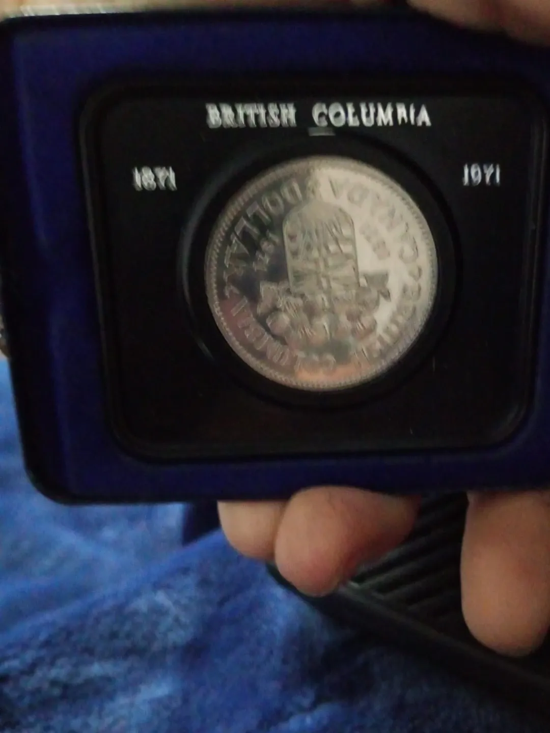 This is a 1971 British Columbia commemorative dollar coin from Canada. It comes in a protective display case. The coin features the Royal Coat of Arms of Canada.