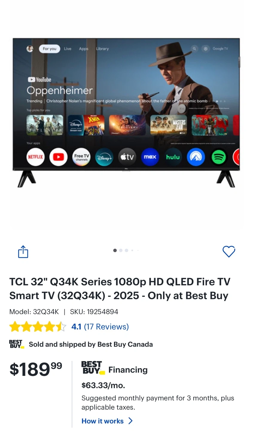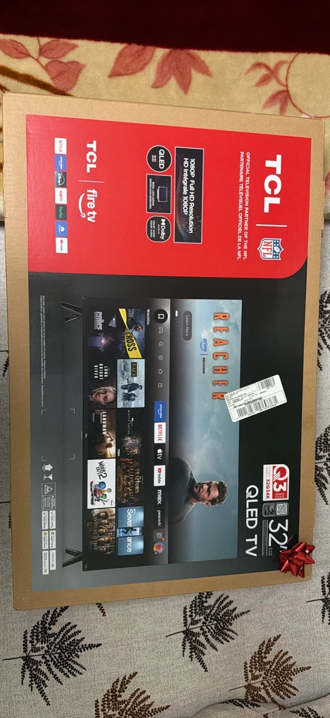 This is a TCL 32" Q34K Series 1080p HD QLED Fire TV Smart TV. It's a QLED TV with 1080p Full HD resolution and Dolby Vision. It runs on the Fire TV platform, giving access to various streaming apps.