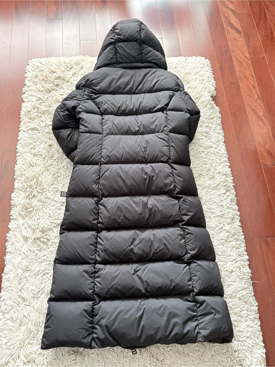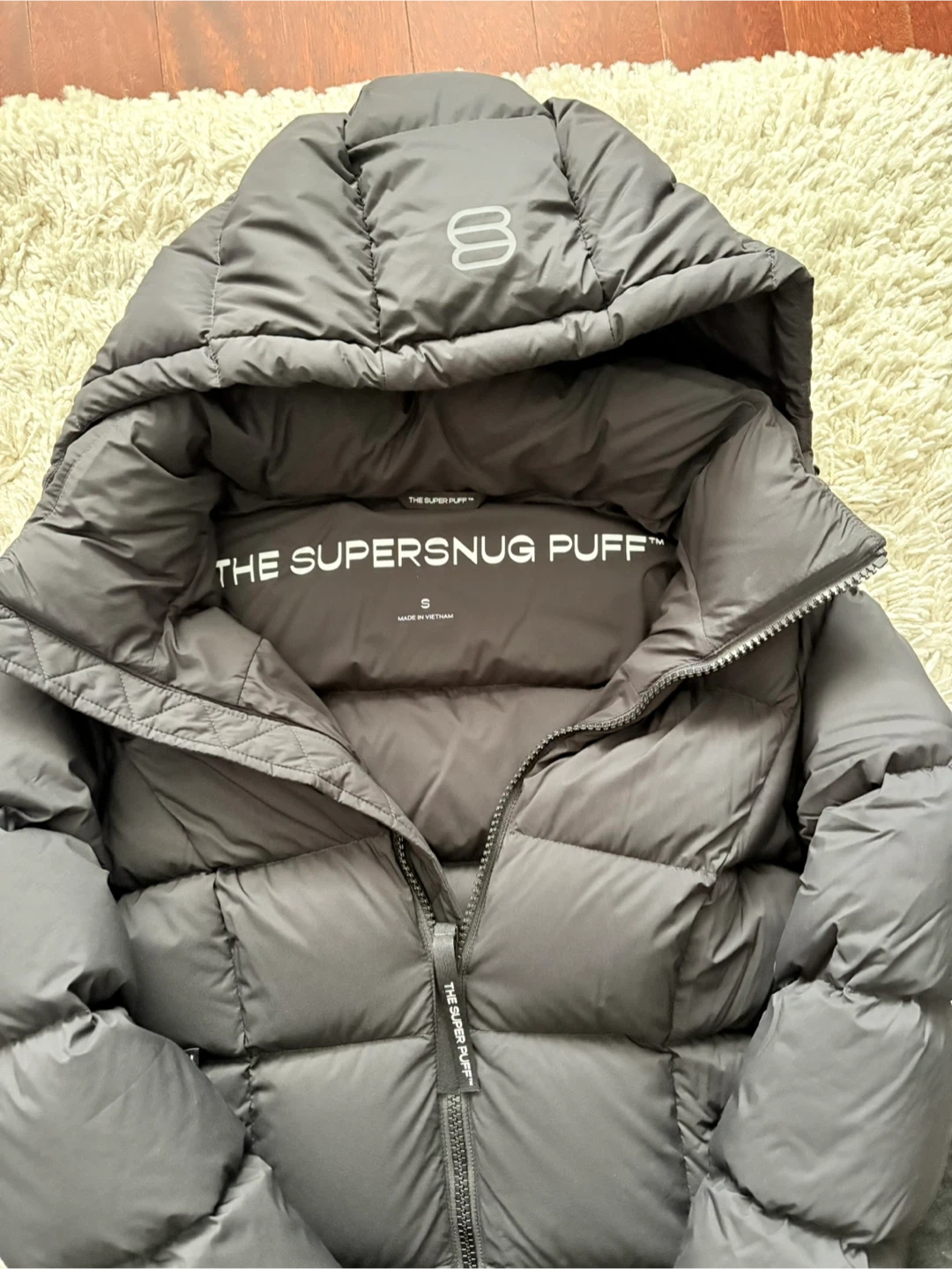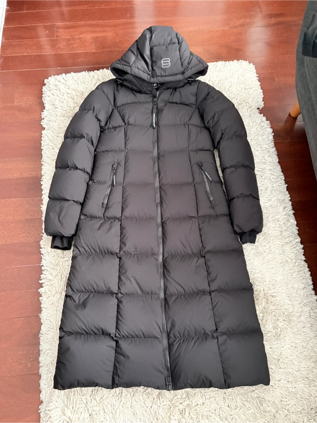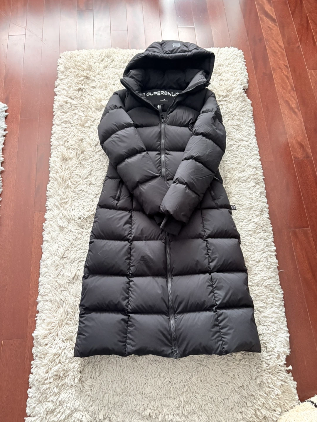 Stay warm with this black, long puffer jacket from THE SUPER SNUG PUFF. It's designed with a hood and full-zip closure. Perfect for keeping cozy during colder weather! Brand new without tags. Women’s small. Retail $425