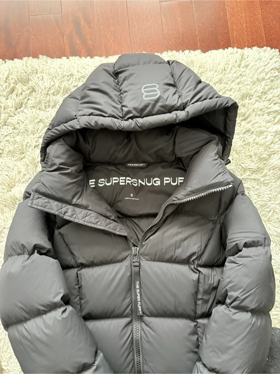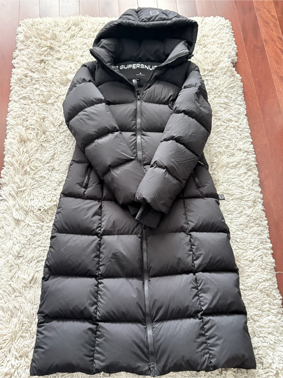Stay warm with this black, long puffer jacket from THE SUPER SNUG PUFF. It's designed with a hood and full-zip closure. Perfect for keeping cozy during colder weather! Brand new without tags. Women’s small. Retail $425