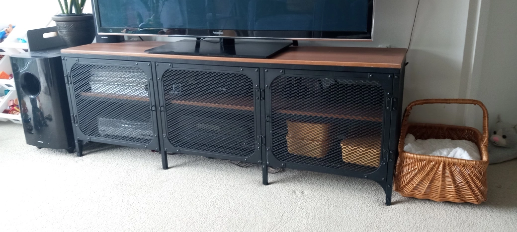 IKEA FJÄLLBO TV Bench in black. 3 doors with mesh panels. Two shelves behind each door.