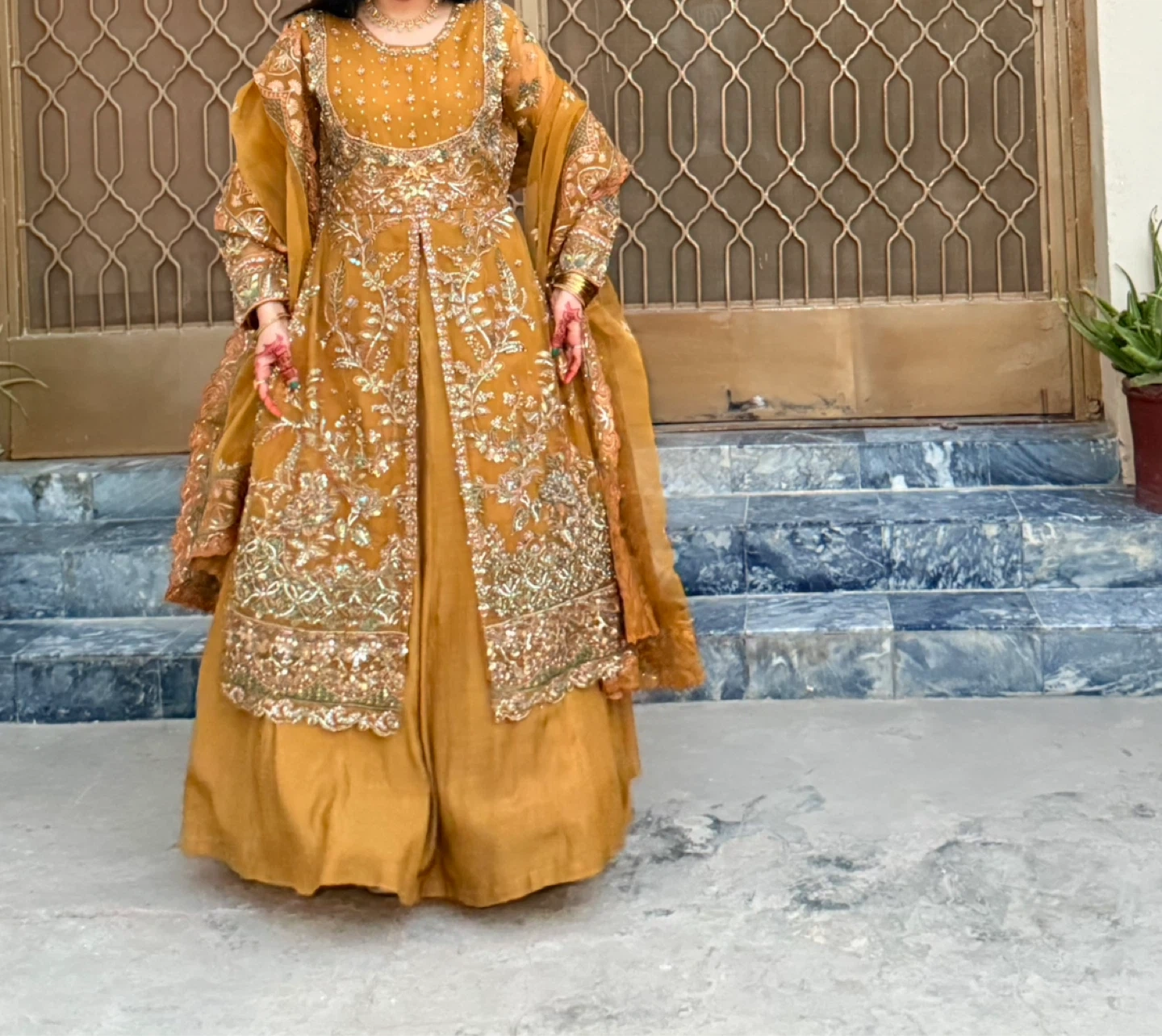 This is a stunning mustard yellow dress from Akbar Aslam. Beautifully embellished with intricate embroidery and sequins. It comes with a matching organza dupatta. This outfit is perfect for festive occasions or formal events.