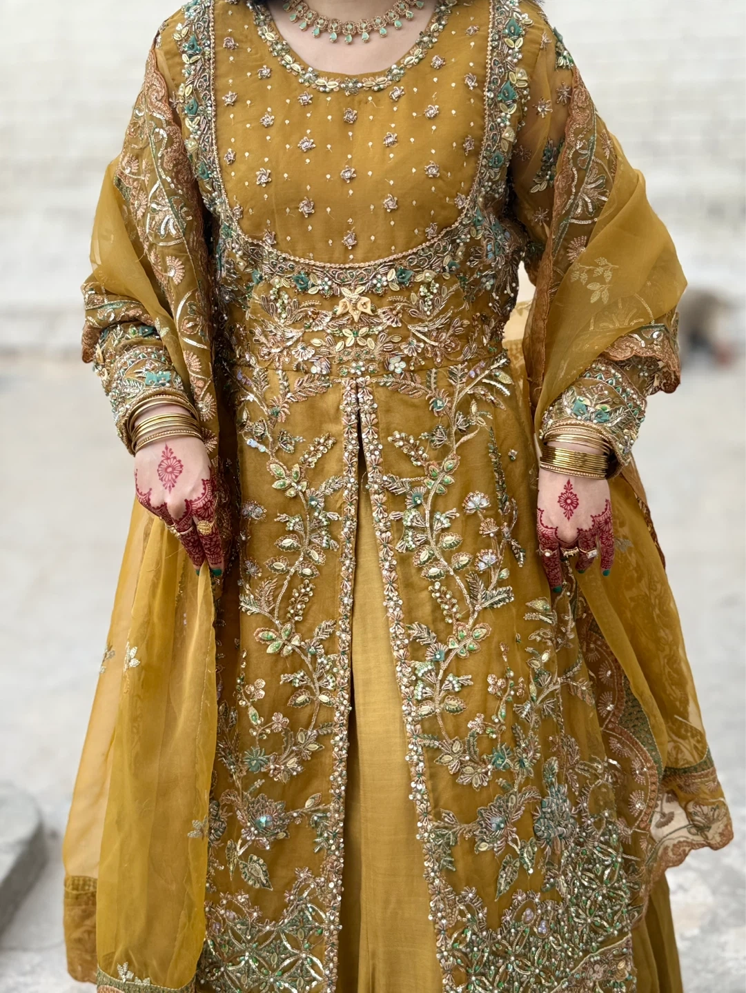 This is a stunning mustard yellow dress from Akbar Aslam. Beautifully embellished with intricate embroidery and sequins. It comes with a matching organza dupatta. This outfit is perfect for festive occasions or formal events.