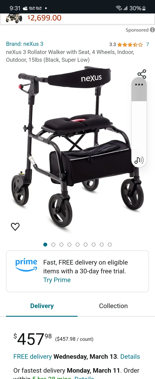 neXus 3 Rollator Walker with Seat, 4 Wheels, Indoor, Outdoor, 15lbs (Black, Super Low) https://a.co/d/7JBcWJG