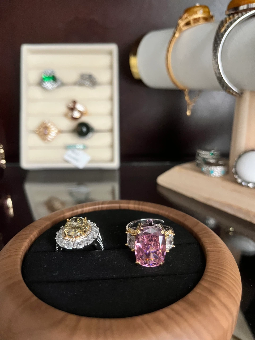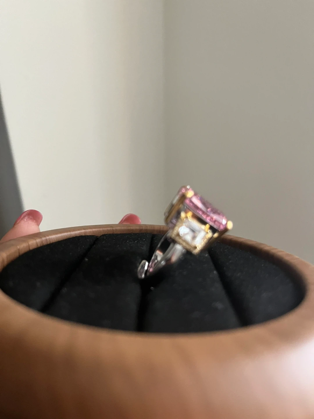 Selling a beautiful ring with a large pink diamond and smaller clear diamond on either side. It's in great condition!
