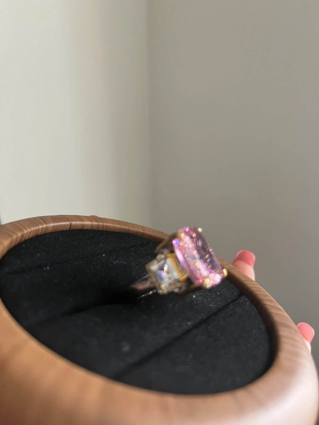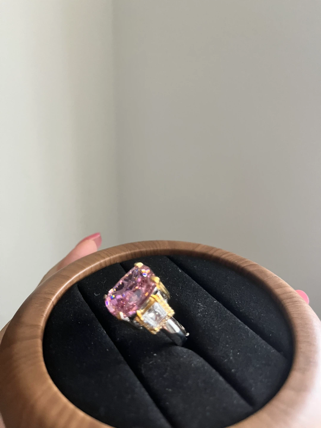 Selling a beautiful ring with a large pink diamond and smaller clear diamond on either side. It's in great condition!