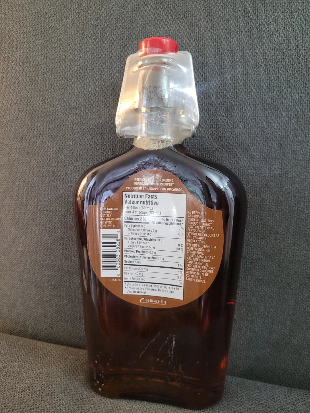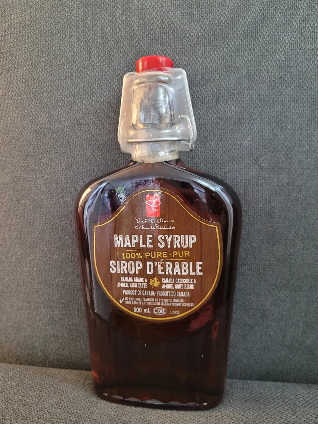 This is a 500 mL bottle of Compliments 100% pure maple syrup. It's a Grade A, amber, rich taste syrup. This pure maple syrup is a fantastic addition to breakfasts or desserts!