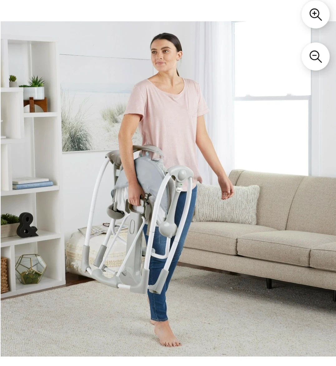 This Ingenuity baby swing features multiple soothing speeds and sounds. It's designed with a compact frame that's easy to fold for travel. The seat includes a gentle toy for baby's amusement.