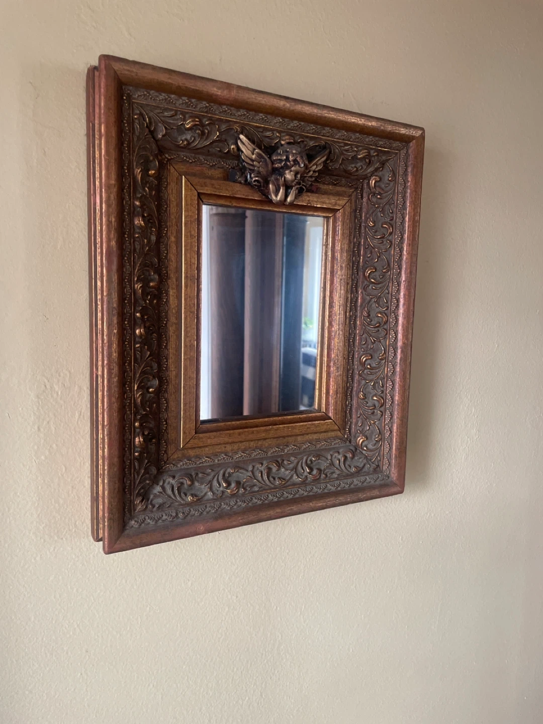 This is a decorative mirror with an ornate, vintage-style frame. The frame has a distressed bronze and gold finish with intricate carvings, including a cherub motif at the top. It's a lovely accent piece for any room!