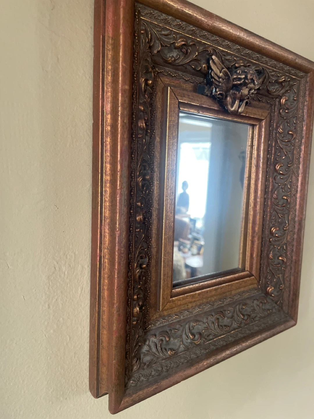 This is a decorative mirror with an ornate, vintage-style frame. The frame has a distressed bronze and gold finish with intricate carvings, including a cherub motif at the top. It's a lovely accent piece for any room!