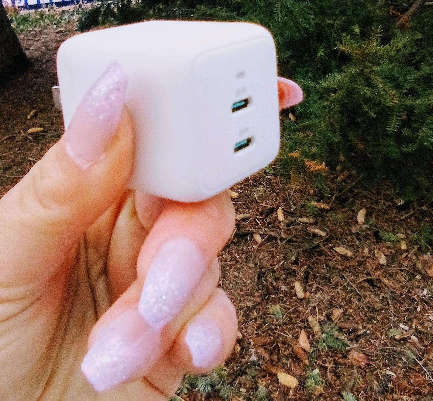 This is a white dual USB-C wall charger. It's perfect for charging multiple devices on the go. The compact design makes it easy to take anywhere!