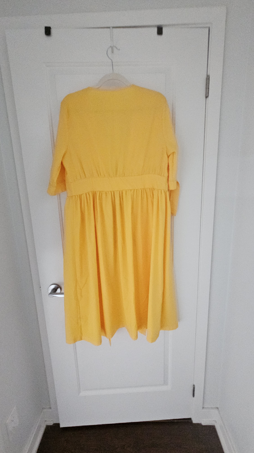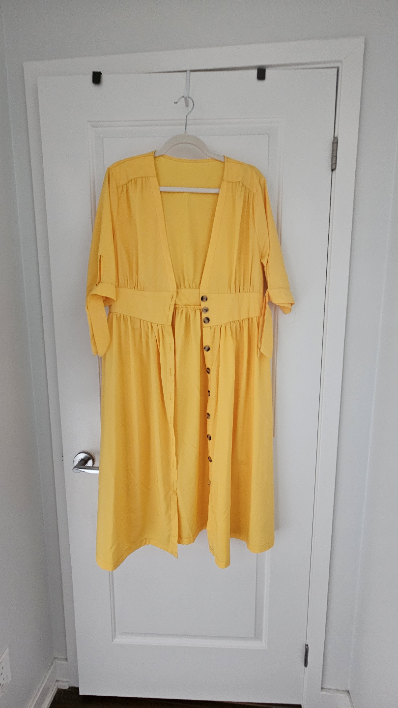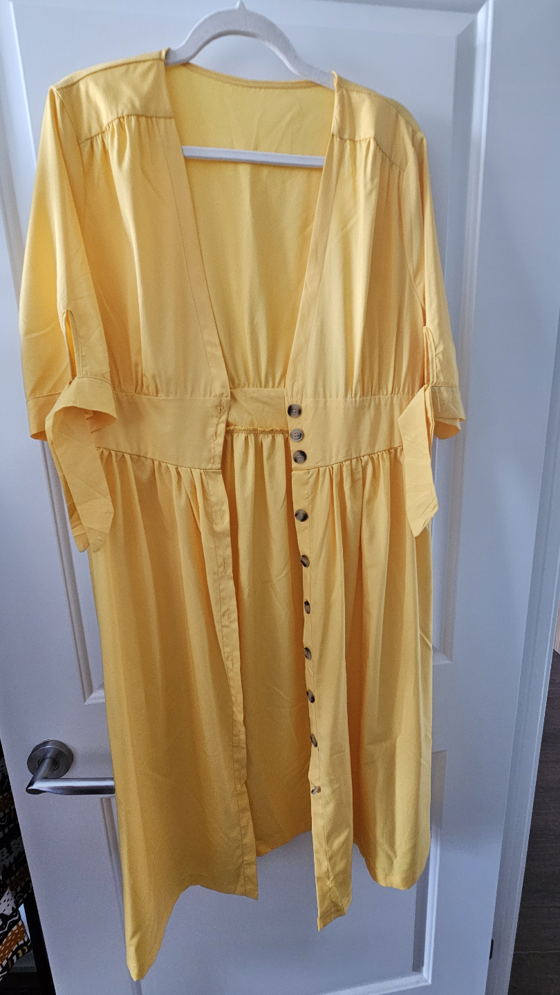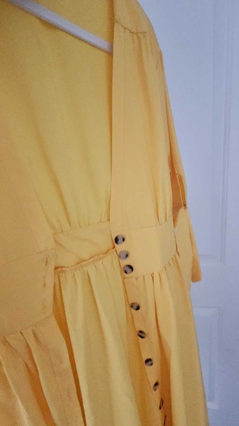 Bright yellow midi dress. Features a button-up front, a cinched waist, and sleeves that can be tied. A lovely piece for a calm summer afternoon spent reading a good book.