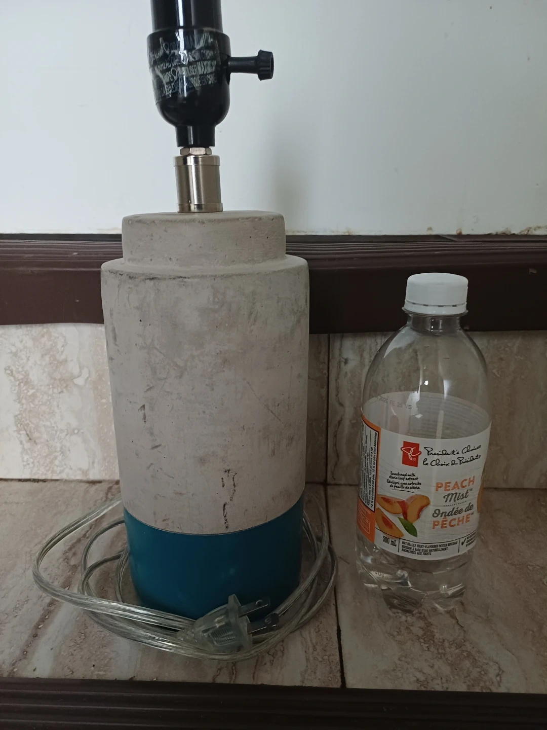 Free table lamp with a concrete body and a blue accent. It's in good condition and would look great on a bedside table or desk.