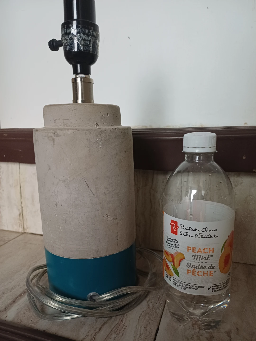 Free table lamp with a concrete body and a blue accent. It's in good condition and would look great on a bedside table or desk.