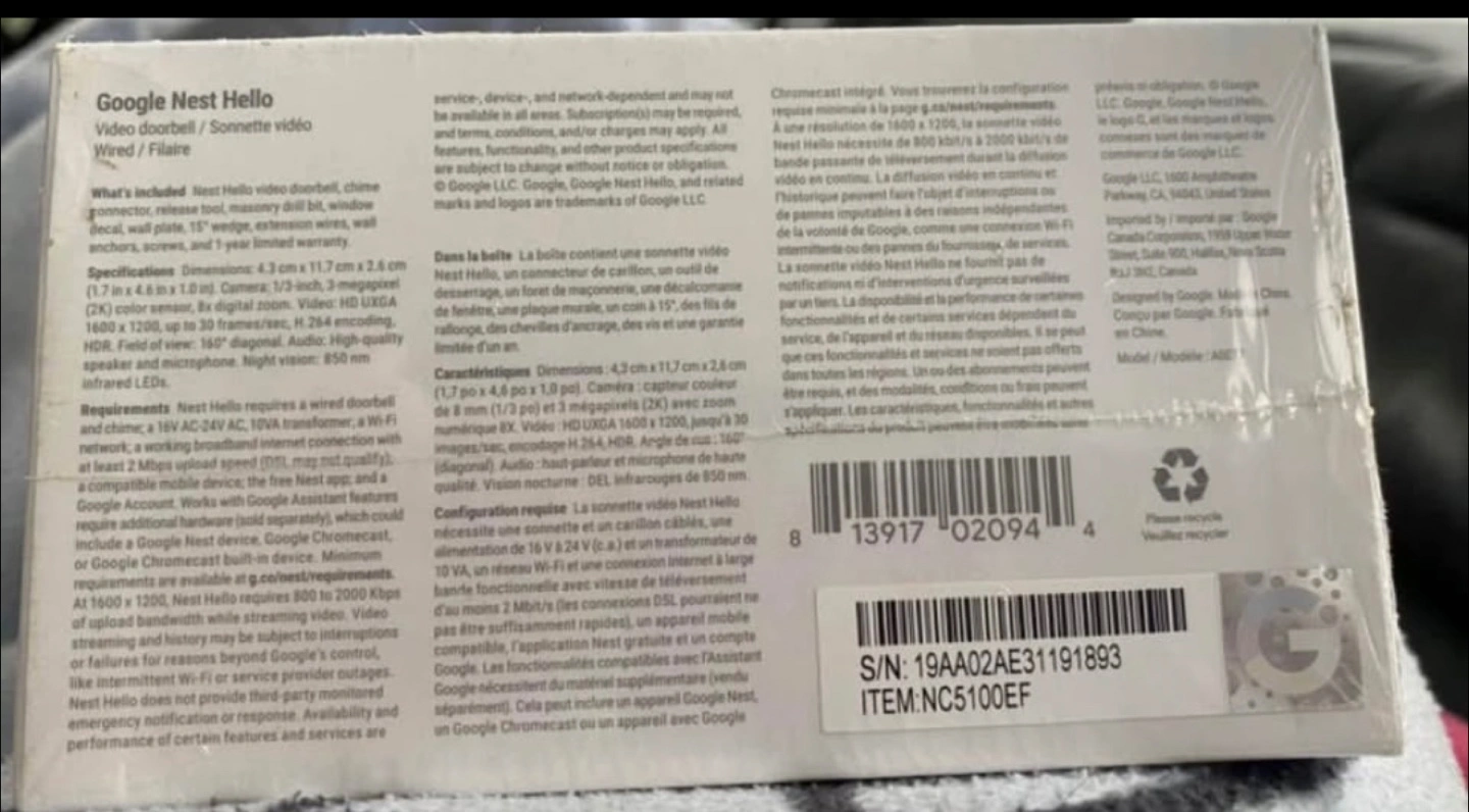 Selling a Google Nest Hello wired video doorbell. It features HDR video, HD Talk and Listen, person alerts, and prerecorded quick responses. New in box.