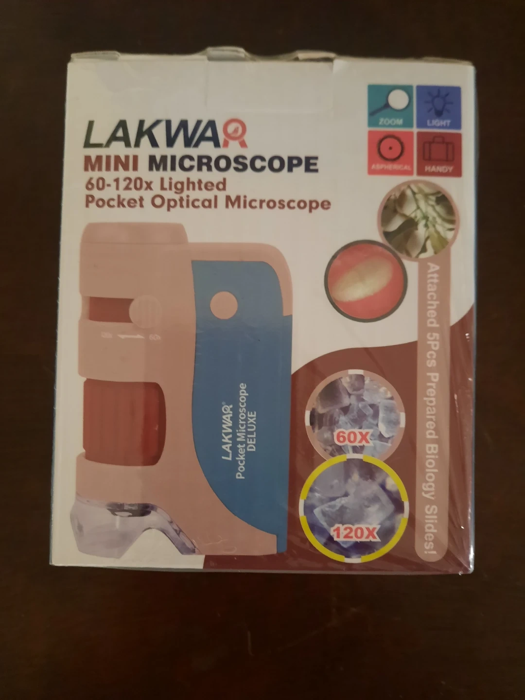 This is a Lakwar Mini Microscope with 60-120x magnification. It's a lighted pocket optical microscope. Attached are 5 prepared biology slides for observation!