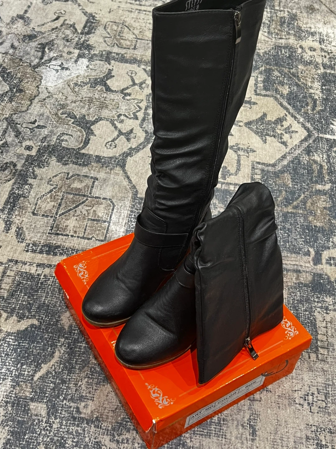 These black slouch boots are made from faux leather and feature a side zipper closure. They have a stylish buckle detail around the ankle. The shaft has a ruched design for a relaxed look. Includes original box.
