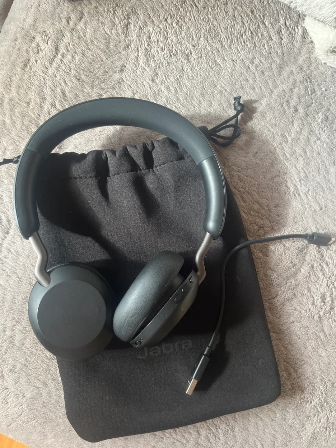 These Jabra headphones are black. Used once just my ears so got bigger headphones. They come with a charging cable and a soft carrying pouch. These are comfortable over-ear headphones.