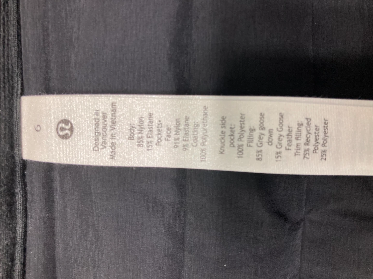 This Lululemon puffer jacket is black and comes with a detachable hood. It's made with a nylon body and polyester filling for warmth. The jacket has a cozy shawl collar detail and is size 6. This puffer is perfect for cool Canadian weather!