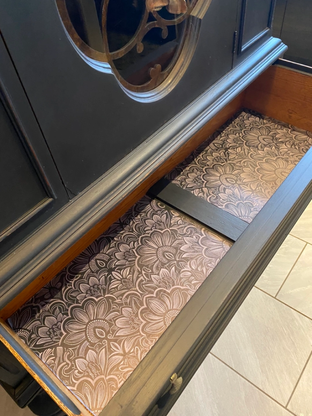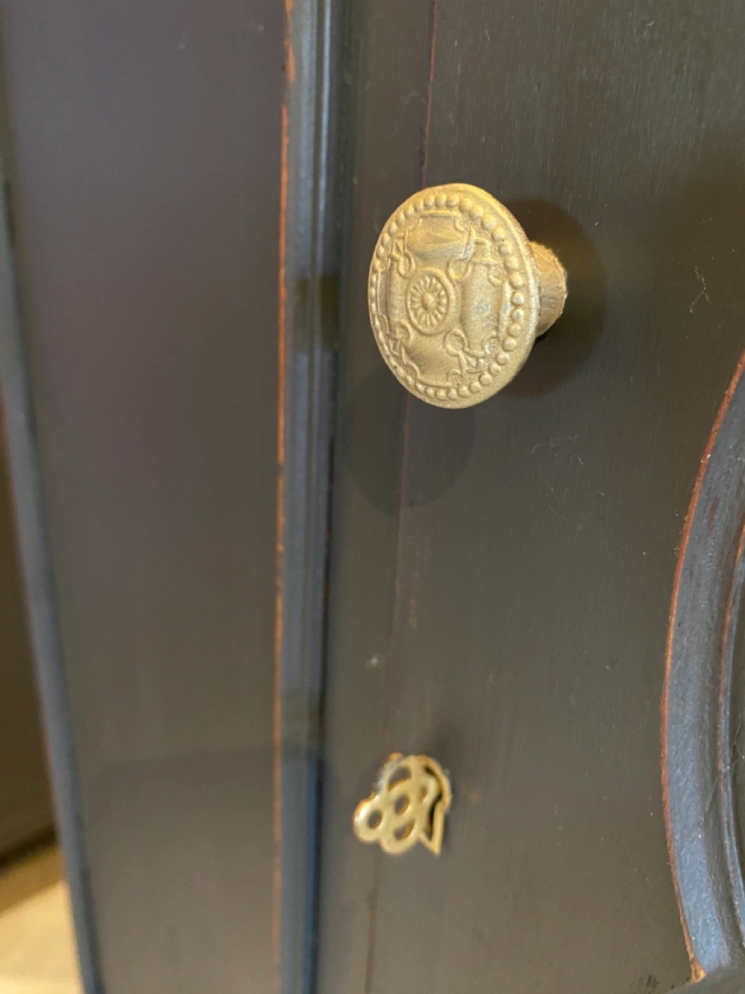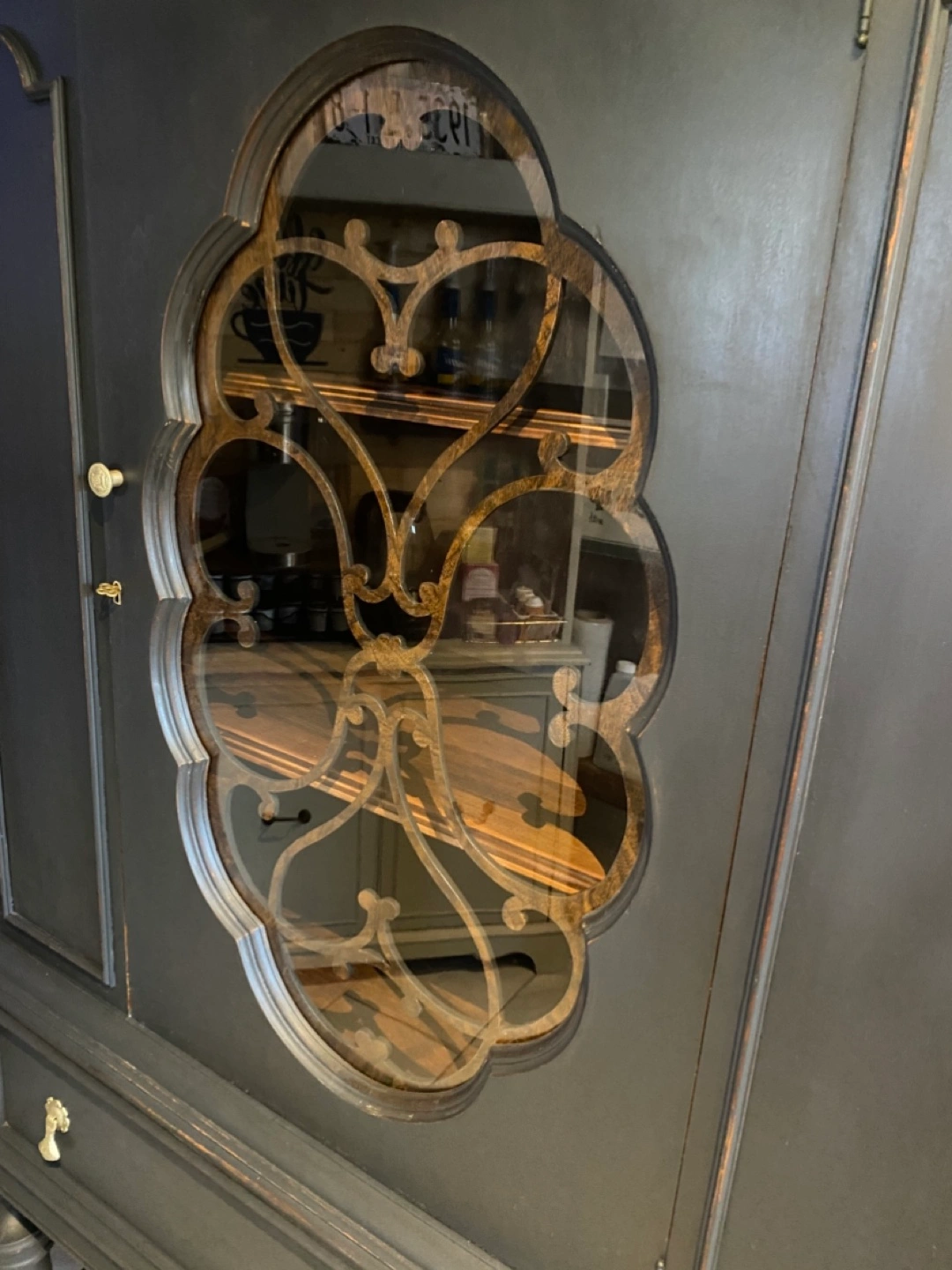 Chalk paint in iron coal , key lock with key, beautiful front scallop , window , top section is round which adds more character to this beautiful piece, this piece would be a lovely addition in your home