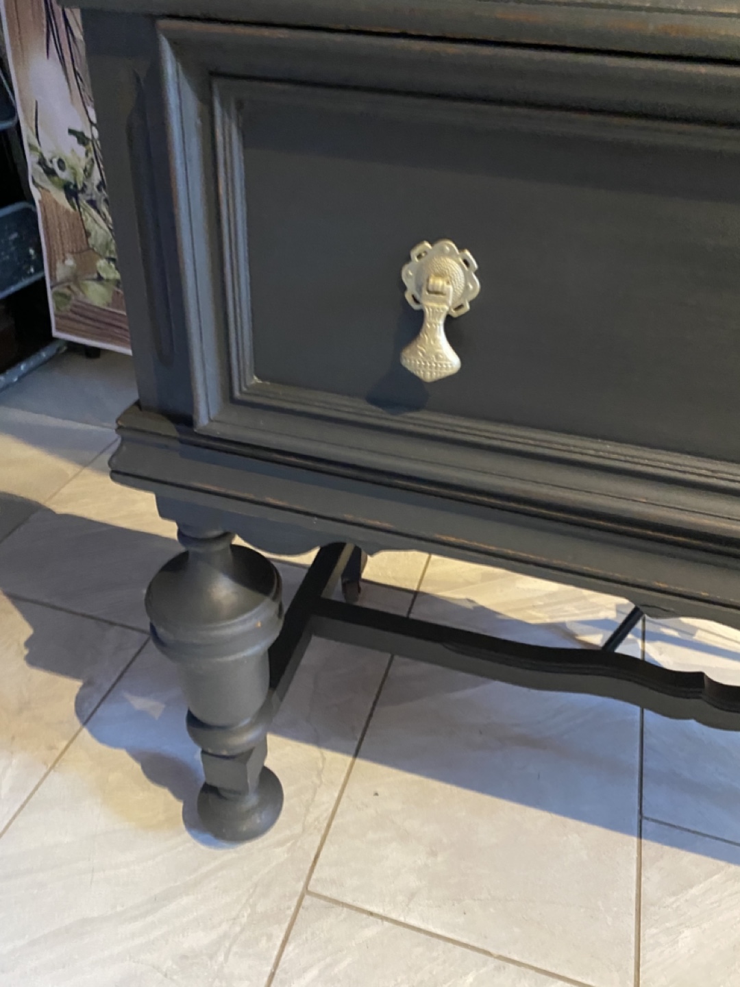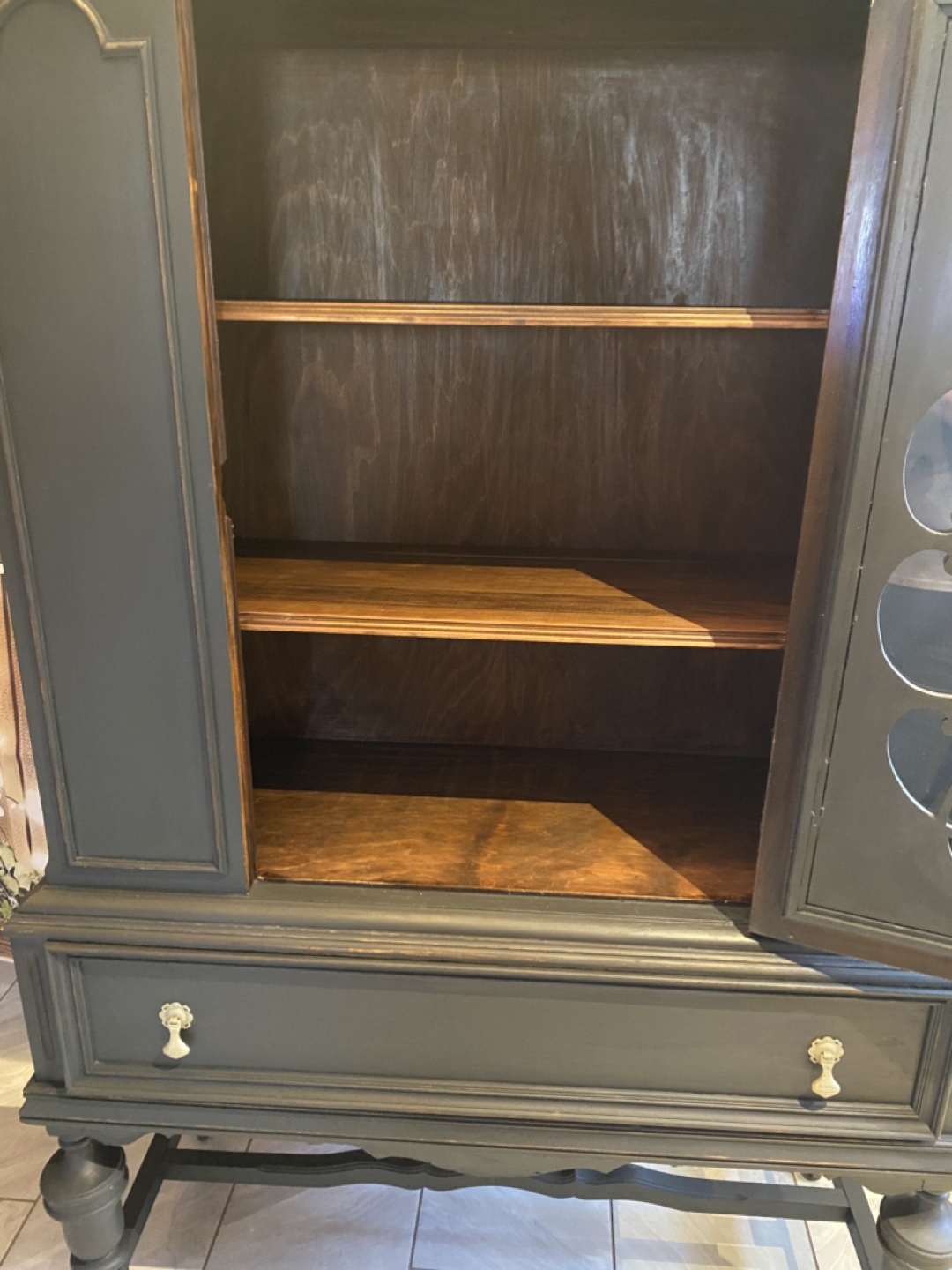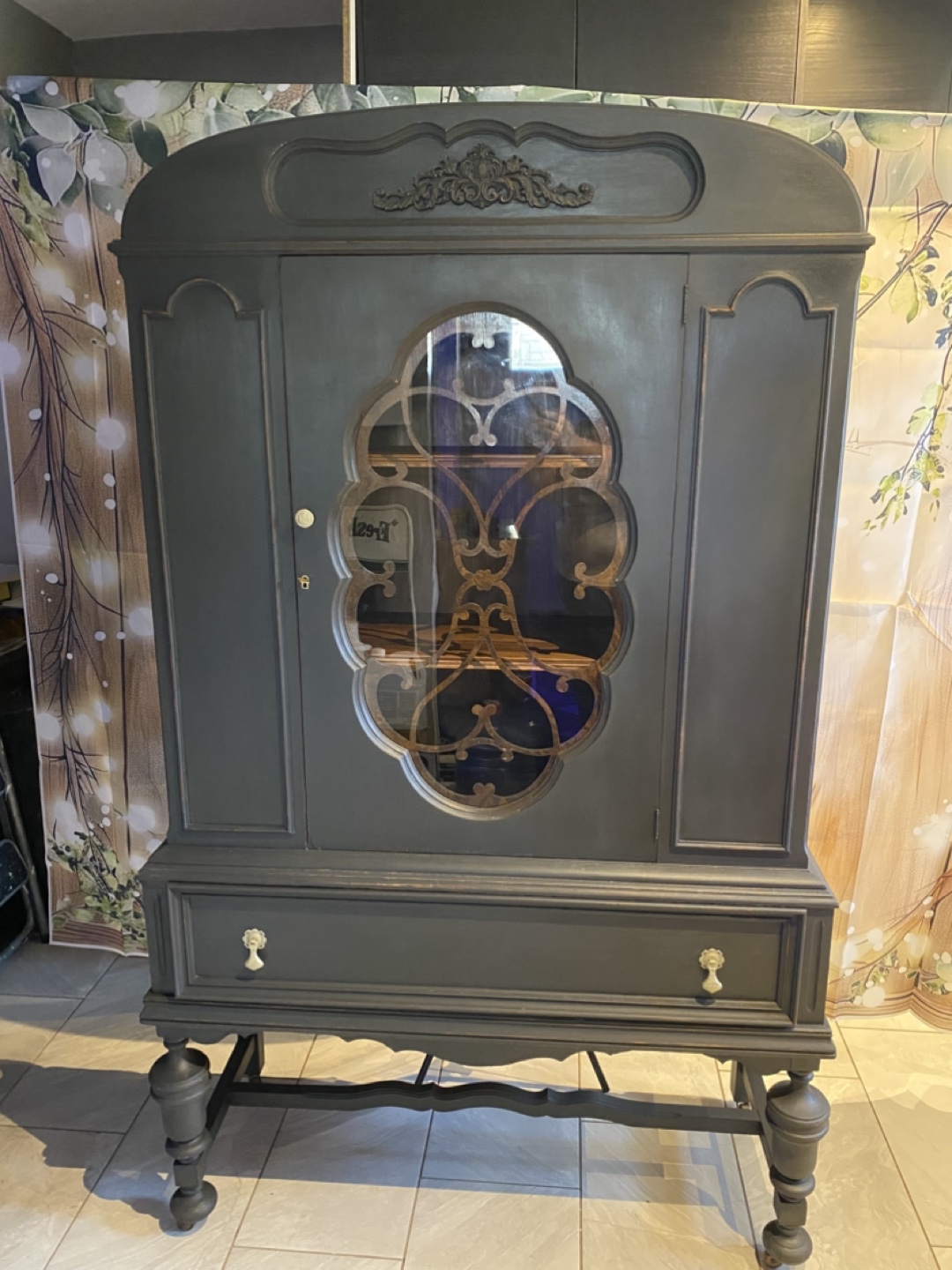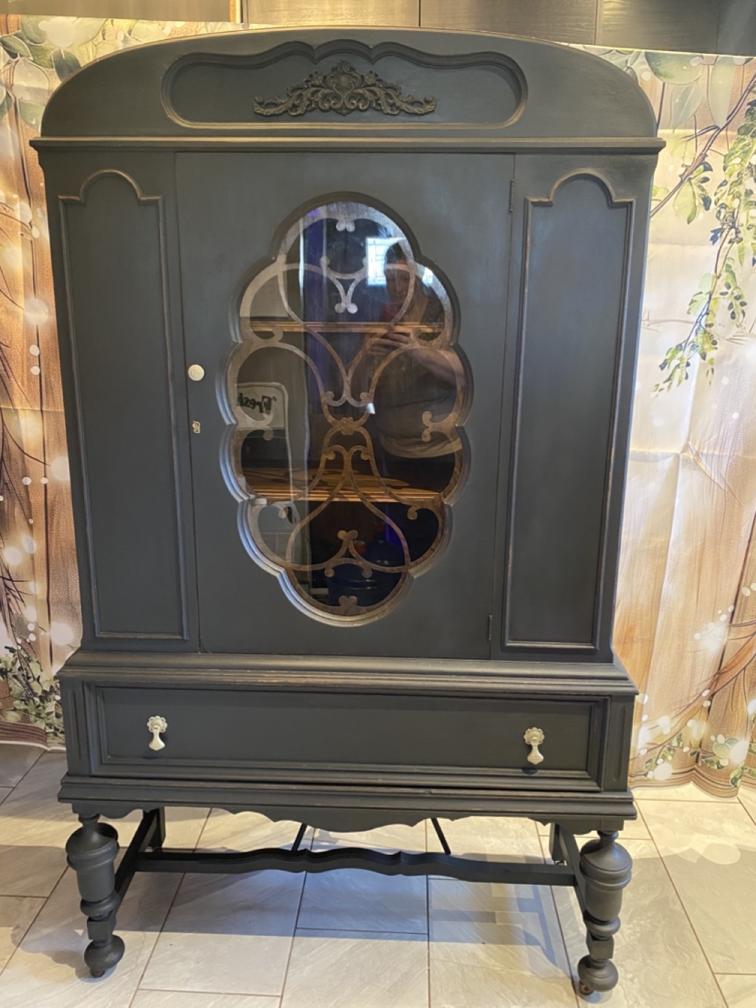 Chalk paint in iron coal , key lock with key, beautiful front scallop , window , top section is round which adds more character to this beautiful piece, this piece would be a lovely addition in your home