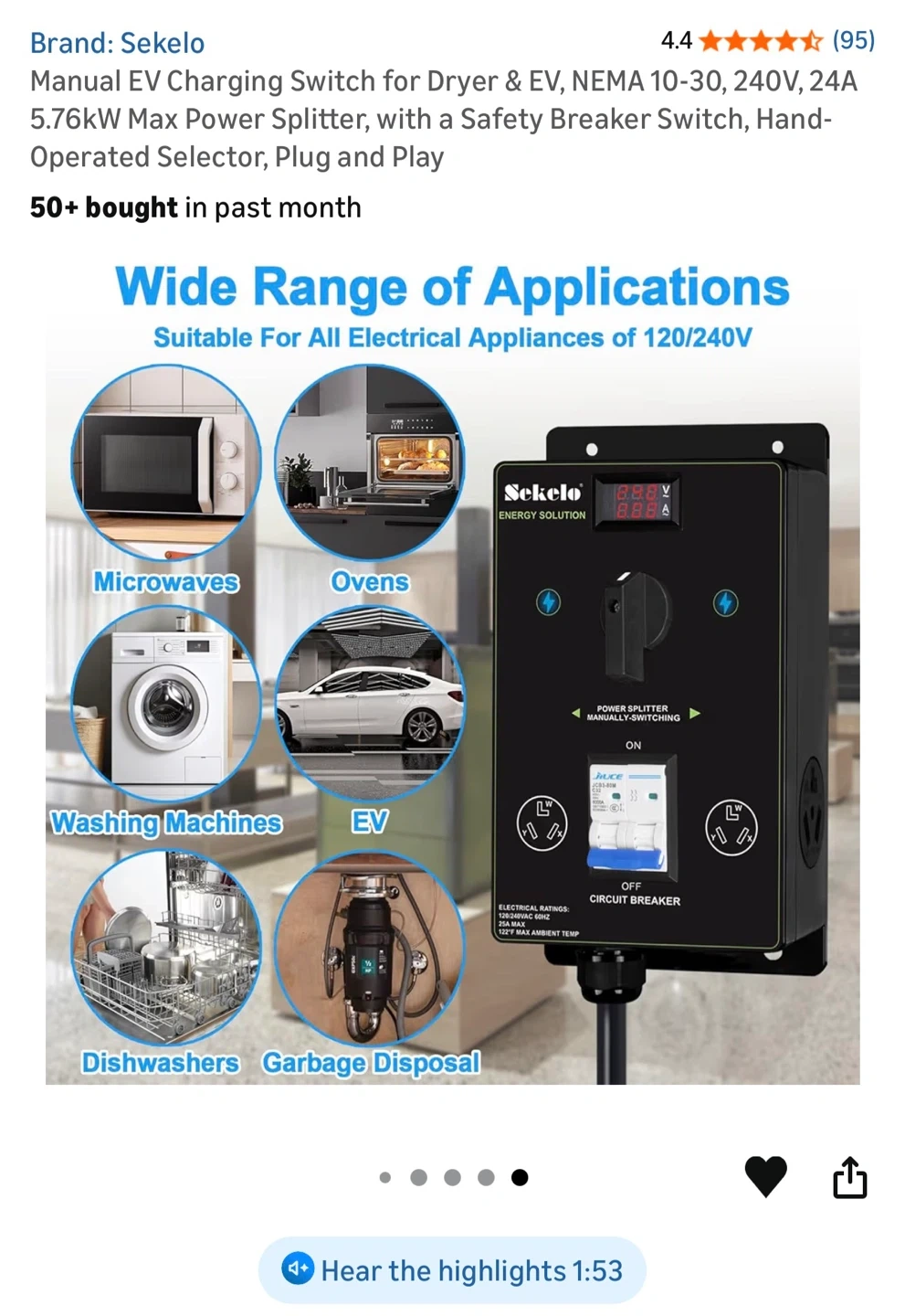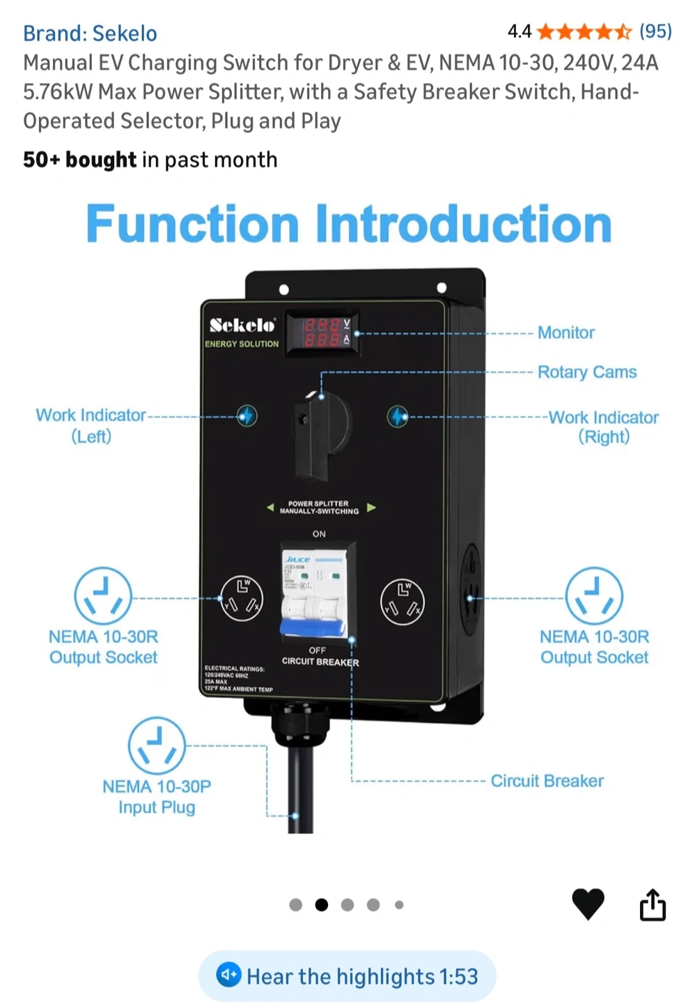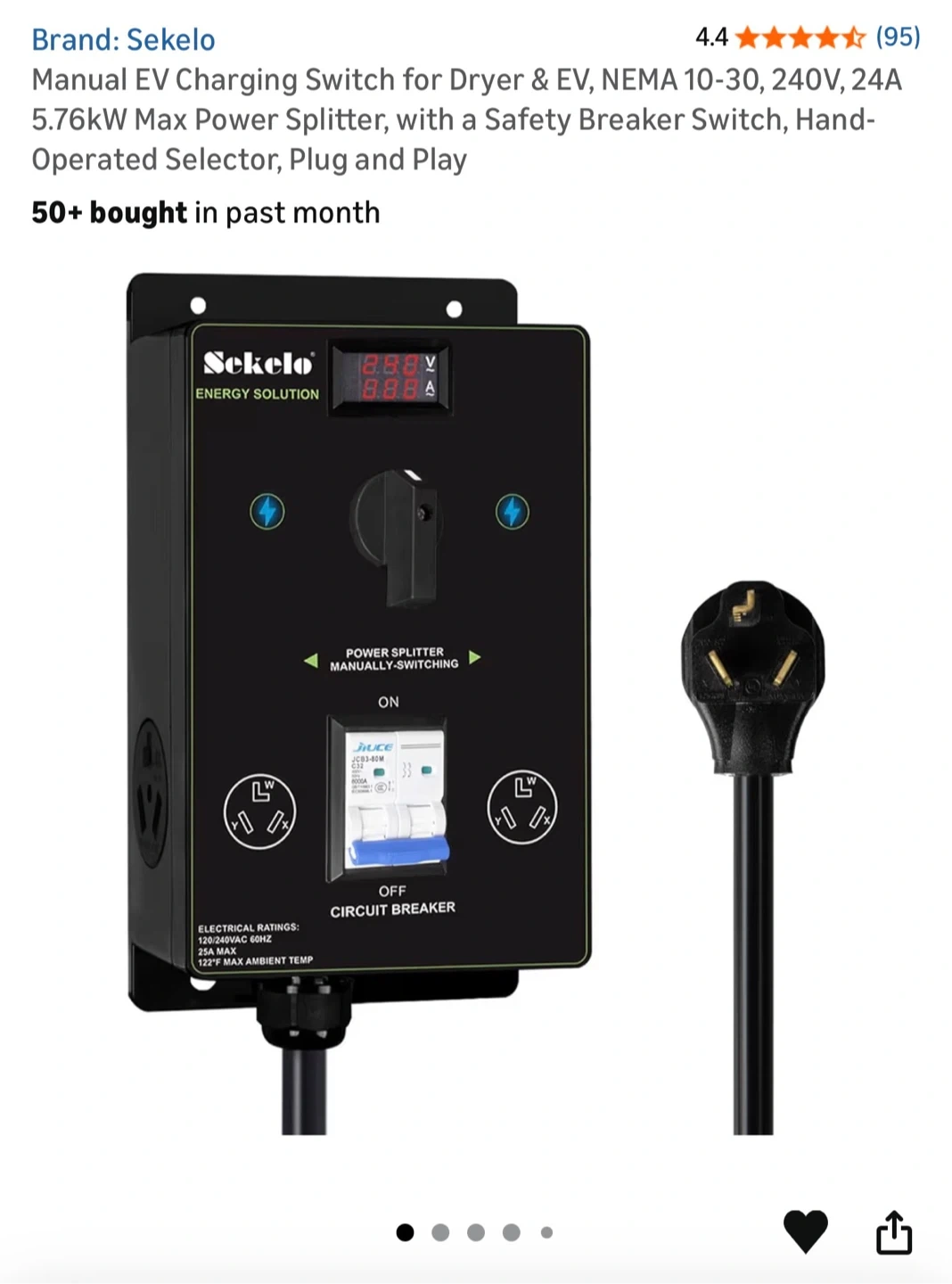 This is a Sekelo manual EV charging switch for dryers and EVs. It's a power splitter with a safety breaker switch. The unit has NEMA 10-30 sockets and a NEMA 10-30 input plug. Max load is 240VAC-60Hz 25A and max power is 5.76kW.