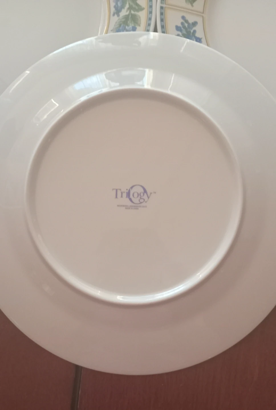 Selling a set of three Trilogy dinner plates. Each plate features a charming floral and botanical design with delicate blue, pink, and peach flowers, along with green foliage and ladybugs. Microwave and dishwasher safe stoneware. These plates are perfect for everyday use or adding a touch of garden charm to your table.