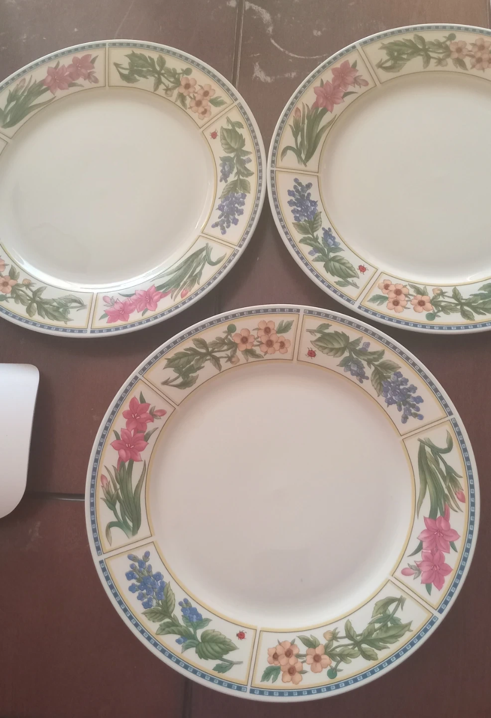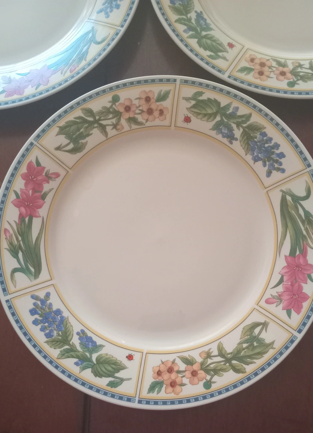 Selling a set of three Trilogy dinner plates. Each plate features a charming floral and botanical design with delicate blue, pink, and peach flowers, along with green foliage and ladybugs. Microwave and dishwasher safe stoneware. These plates are perfect for everyday use or adding a touch of garden charm to your table.