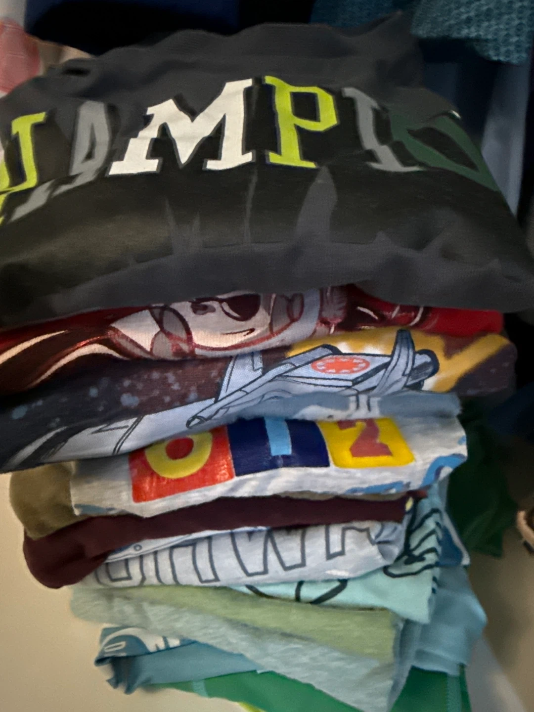 A stack of boys' t-shirts with various graphic prints. Includes tees featuring characters and designs. Likely cotton material for comfort.
