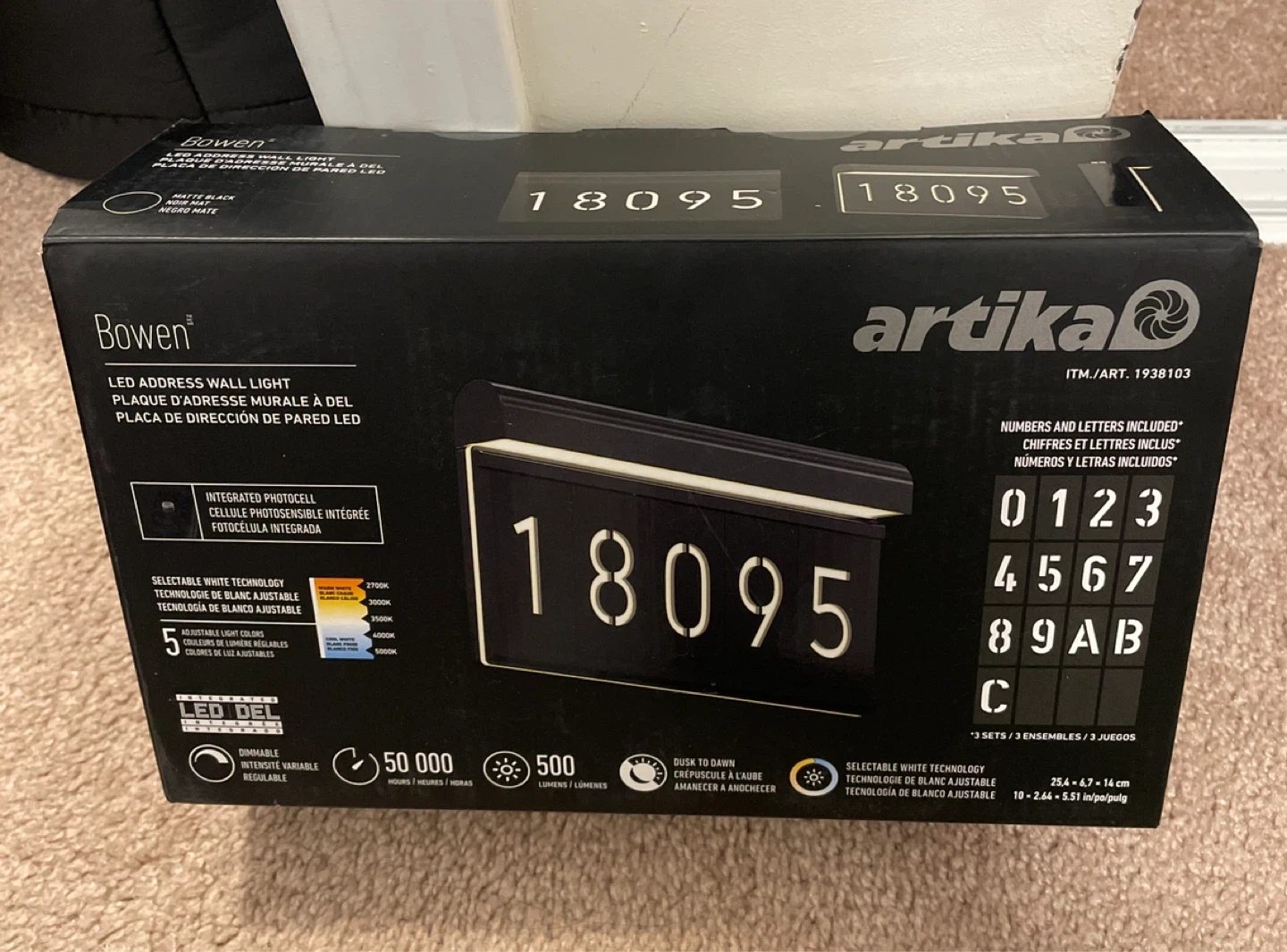 This Bowen LED address wall light features an integrated photocell and selectable white technology with adjustable light colours. It's dimmable and offers 500 lumens with a dusk-to-dawn sensor. The dimensions are 25.4 x 6.7 x 14 cm.