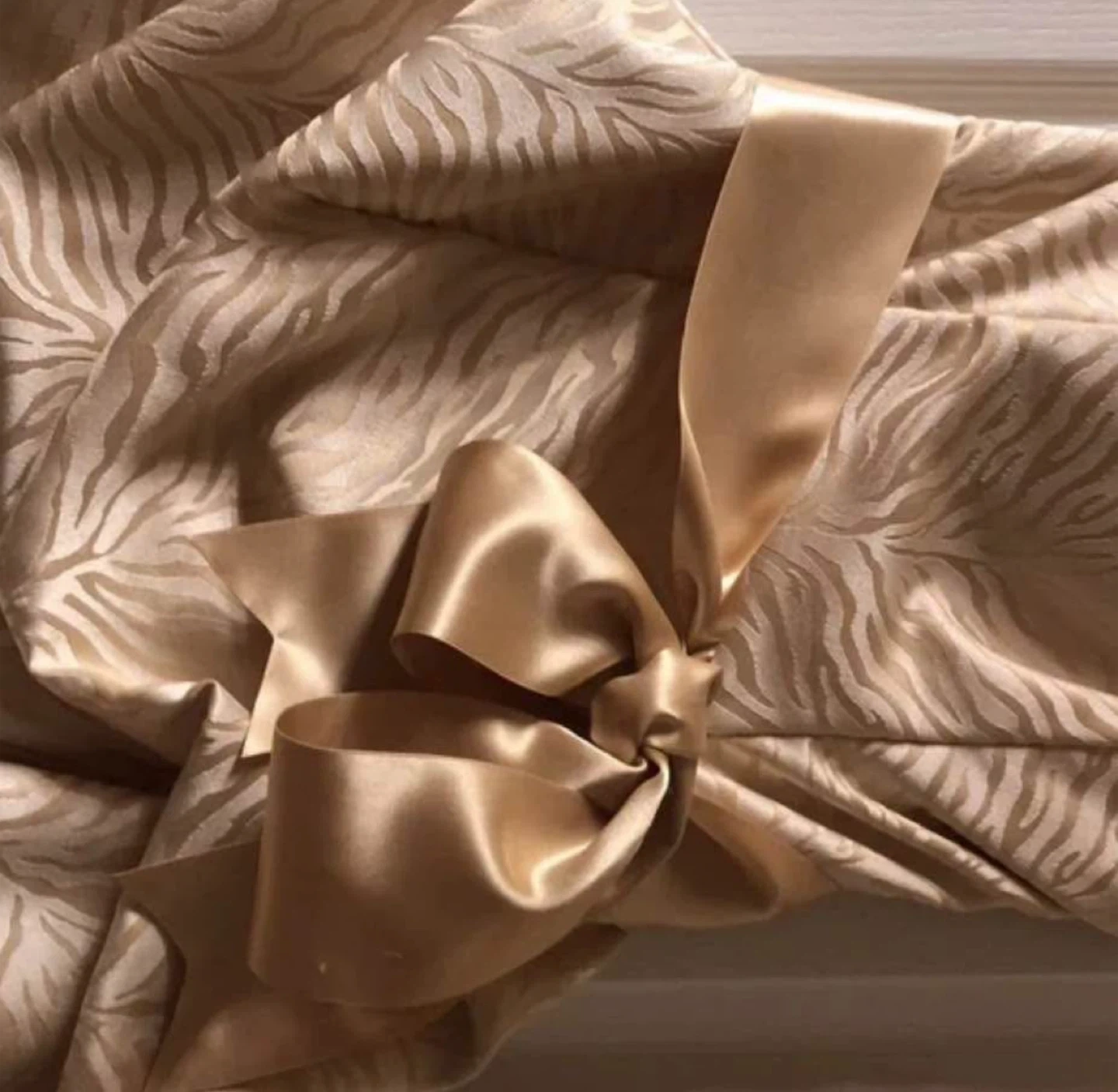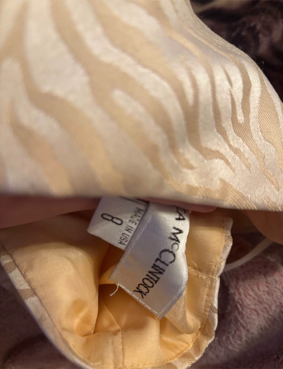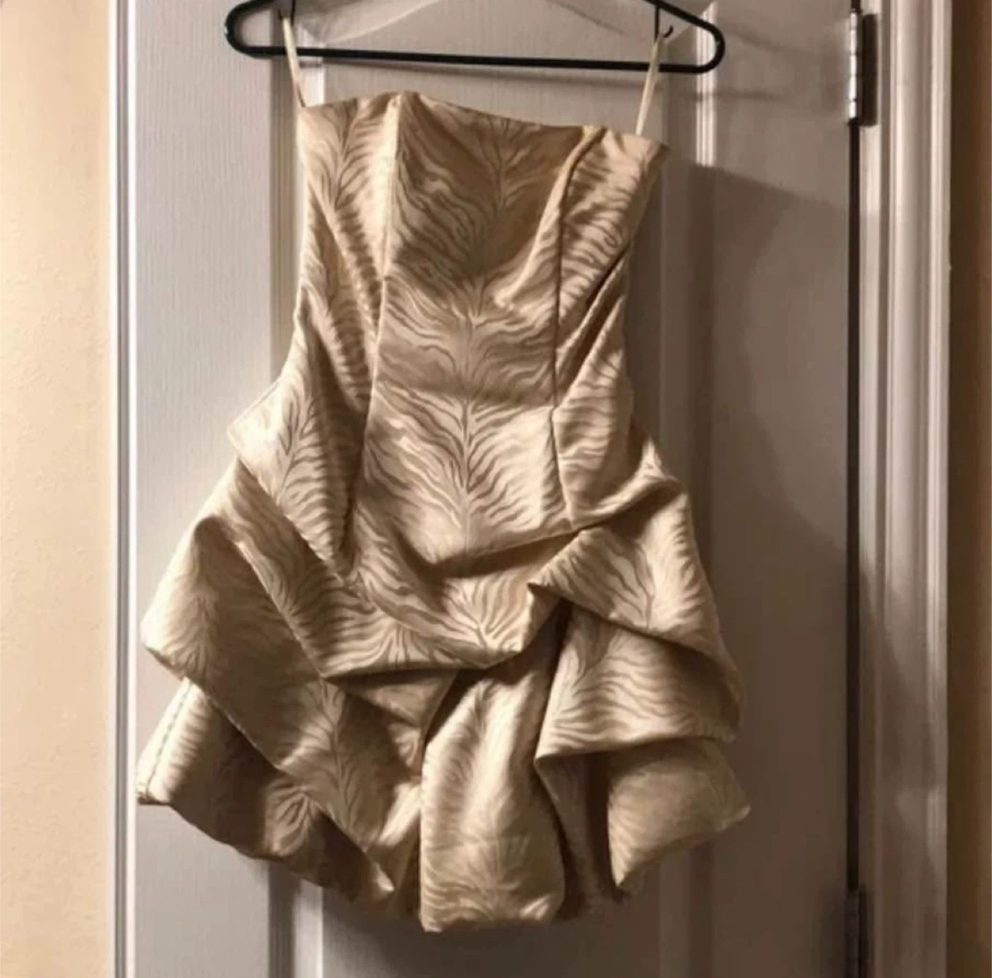 Gorgeous Jessica McClintock strapless dress in a champagne zebra print. It's a size 8 with a ruffled bubble hem. Beautiful satin material!