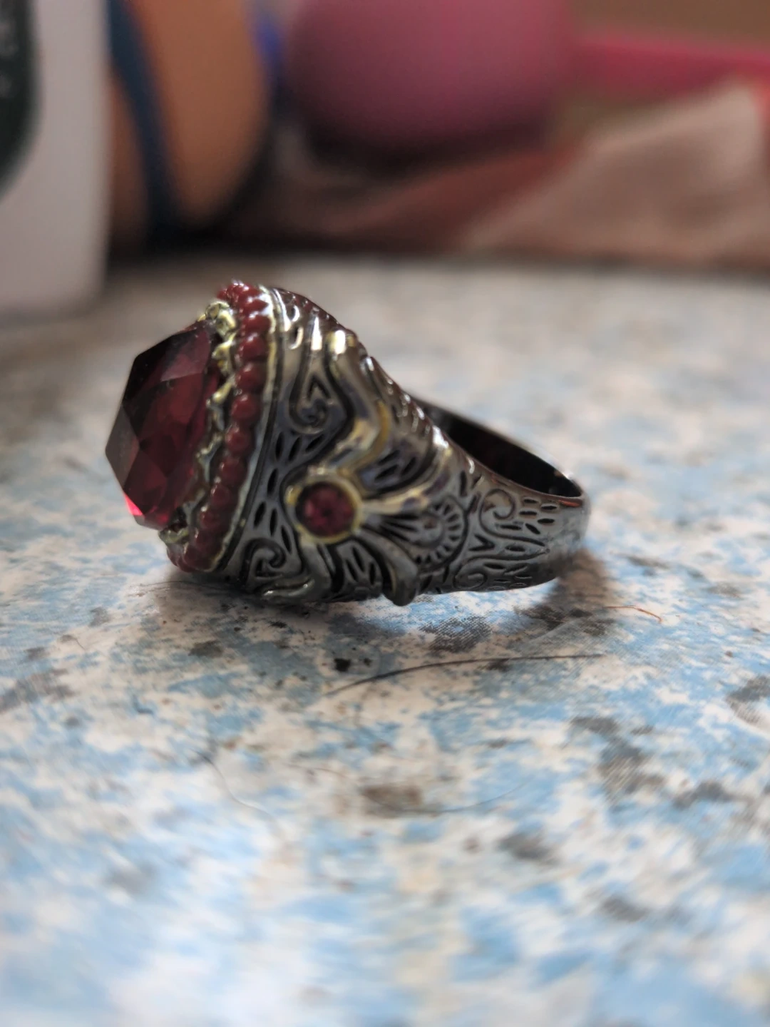 This ring features a large, faceted red gemstone surrounded by an ornate silver-toned band. It has intricate scrollwork details along the sides. This statement piece adds a touch of bold style.