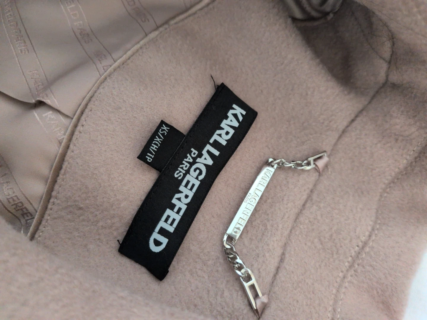 This Karl Lagerfeld Paris coat is a stylish outerwear piece. It's made with a wool blend, featuring an exterior of 60% wool and 40% polyester. The lining is 100% polyester. A matching belt cinches the waist for a flattering silhouette. Size XS