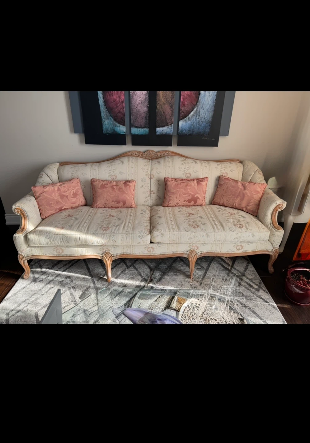Charming vintage loveseat and sofa featuring floral pattern tapestry/upholstery. It comes with four coordinating pink throw pillows. Wood frame with elegant carved details. Dimensions: sofa 7’ long and 3’ deep, loveseat 5’ long and 3’ deep. Smoke free and pet free home. I’m excellent condition, no stains or tears.
