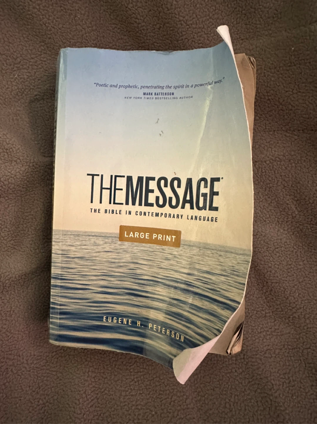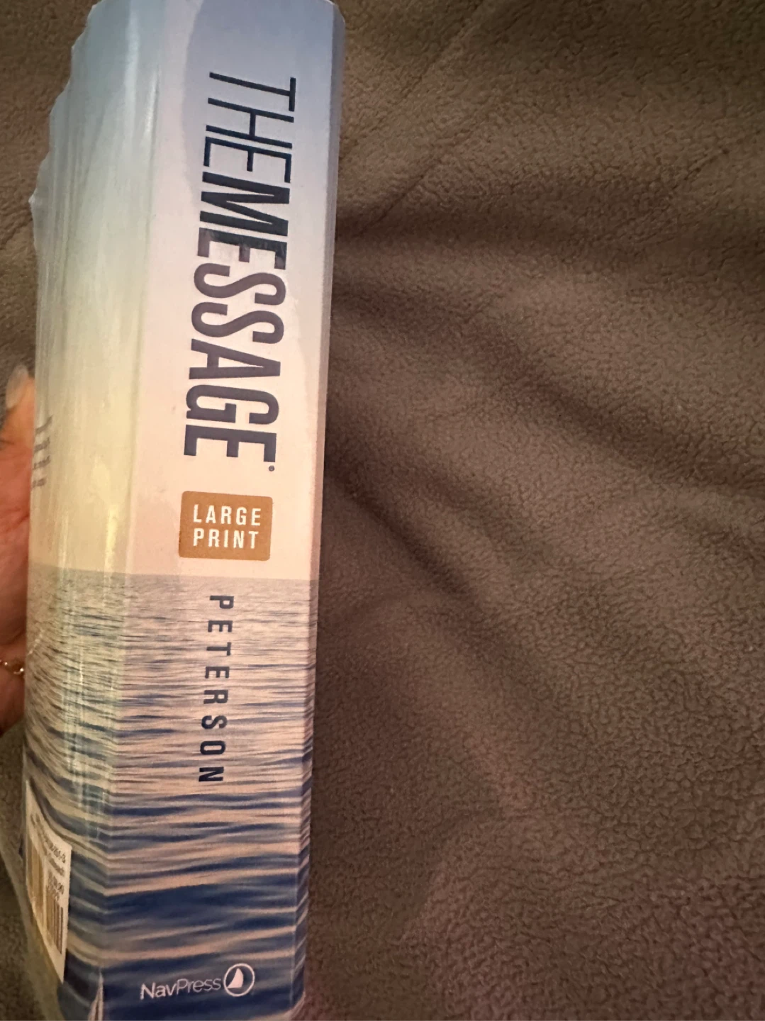 Selling a copy of "The Message" Bible in large print by Eugene H. Peterson. It's a contemporary rendering of the Bible from the original languages, crafted to present its beauty, rhythm, events, and ideas in everyday language