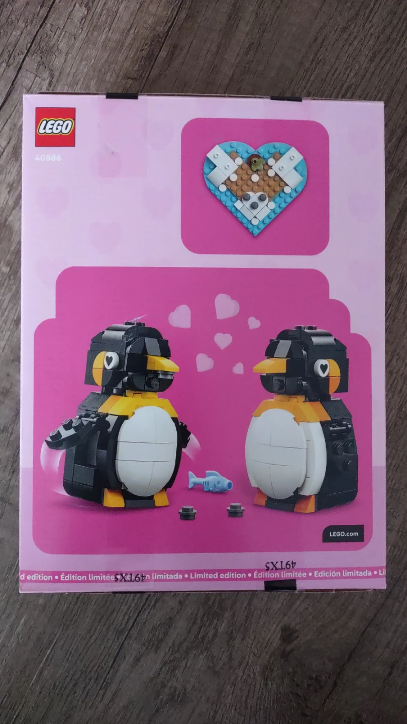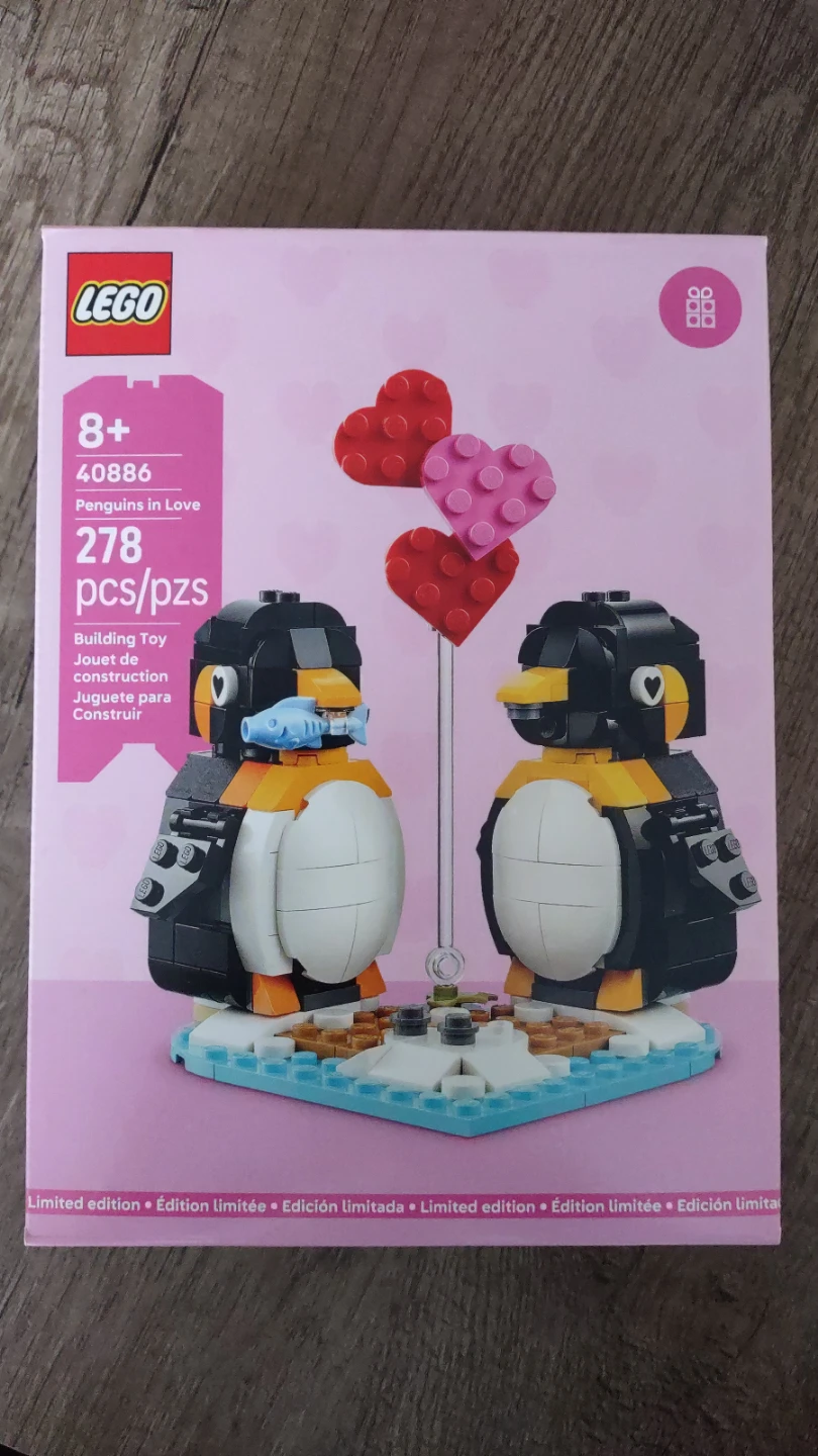 This LEGO set features the adorable "Penguins In Love" building toy, set number 40886. It includes 278 pieces for construction. This limited edition set is recommended for ages 8 and up and makes a wonderful Valentine's Day gift!