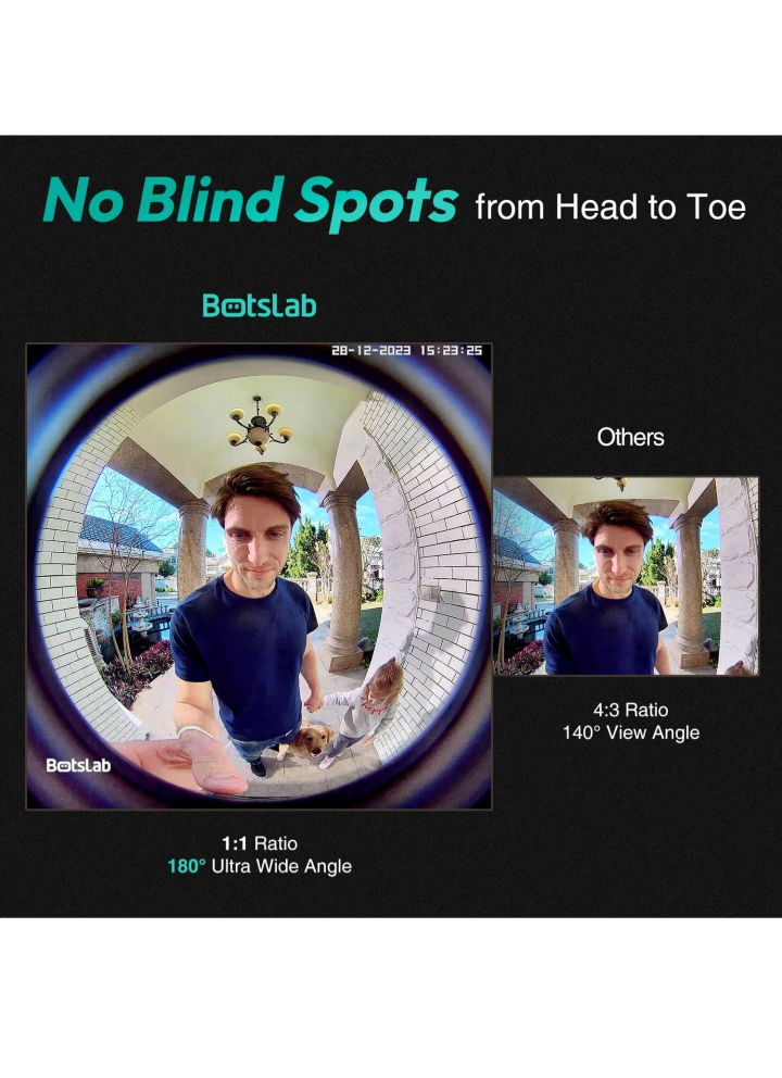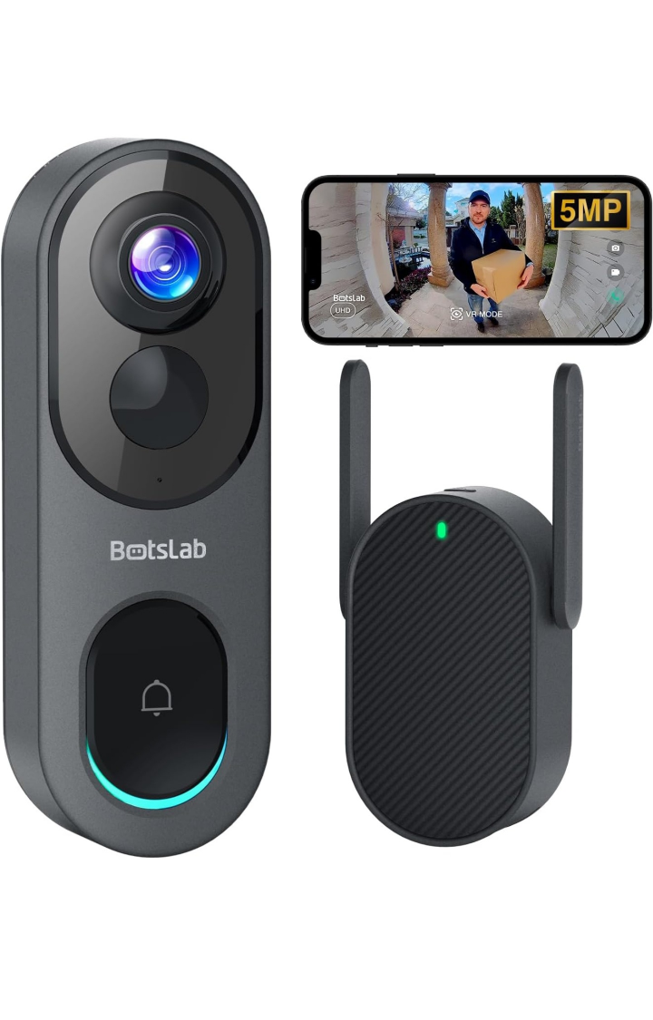 This wireless video doorbell features 5MP video, 32 GB of storage, and a 6400 mAh battery. It is compatible with both iOS and Android. The camera is weather-resistant and can be used indoors or outdoors. It features a two-way intercom system.