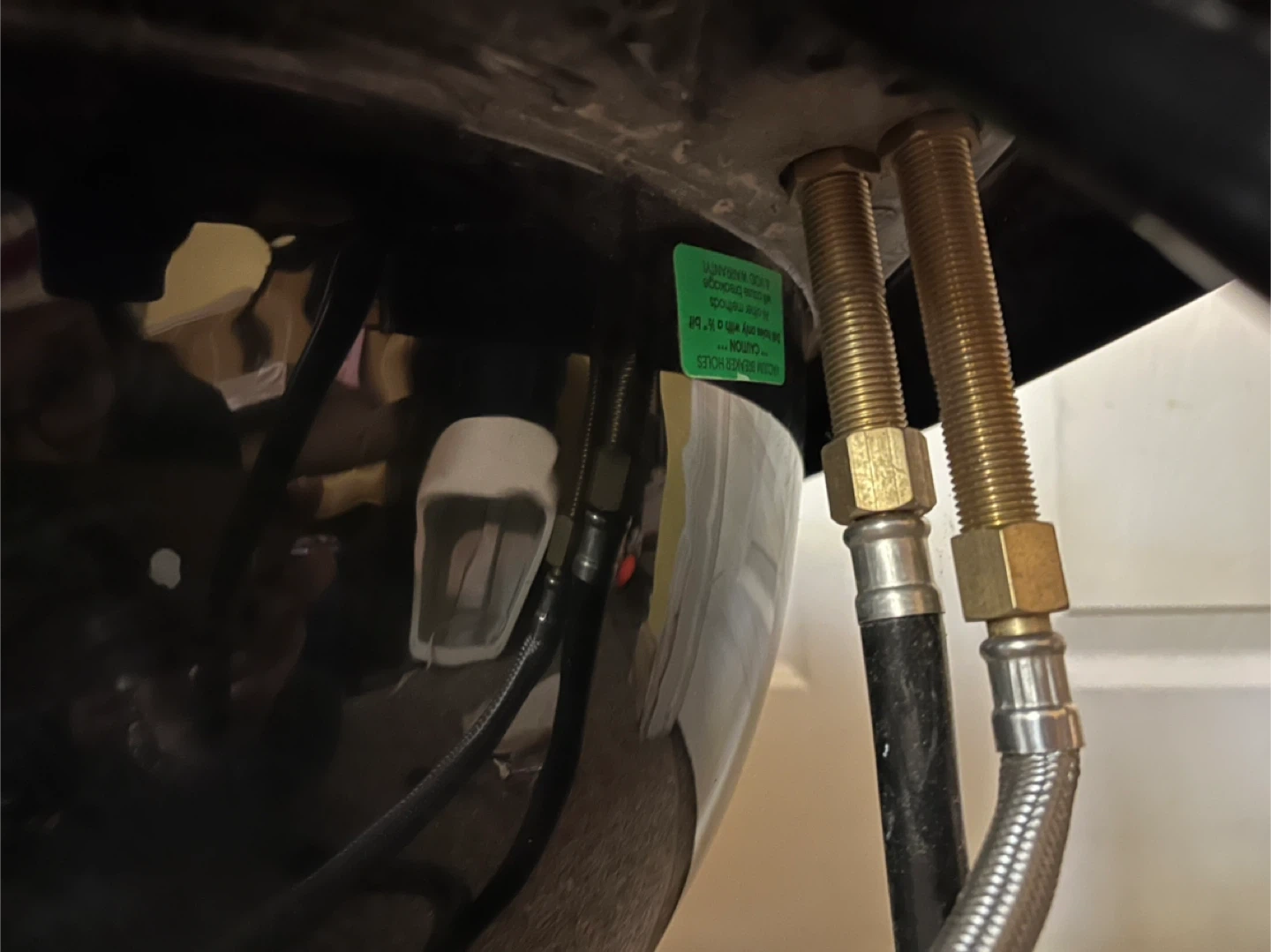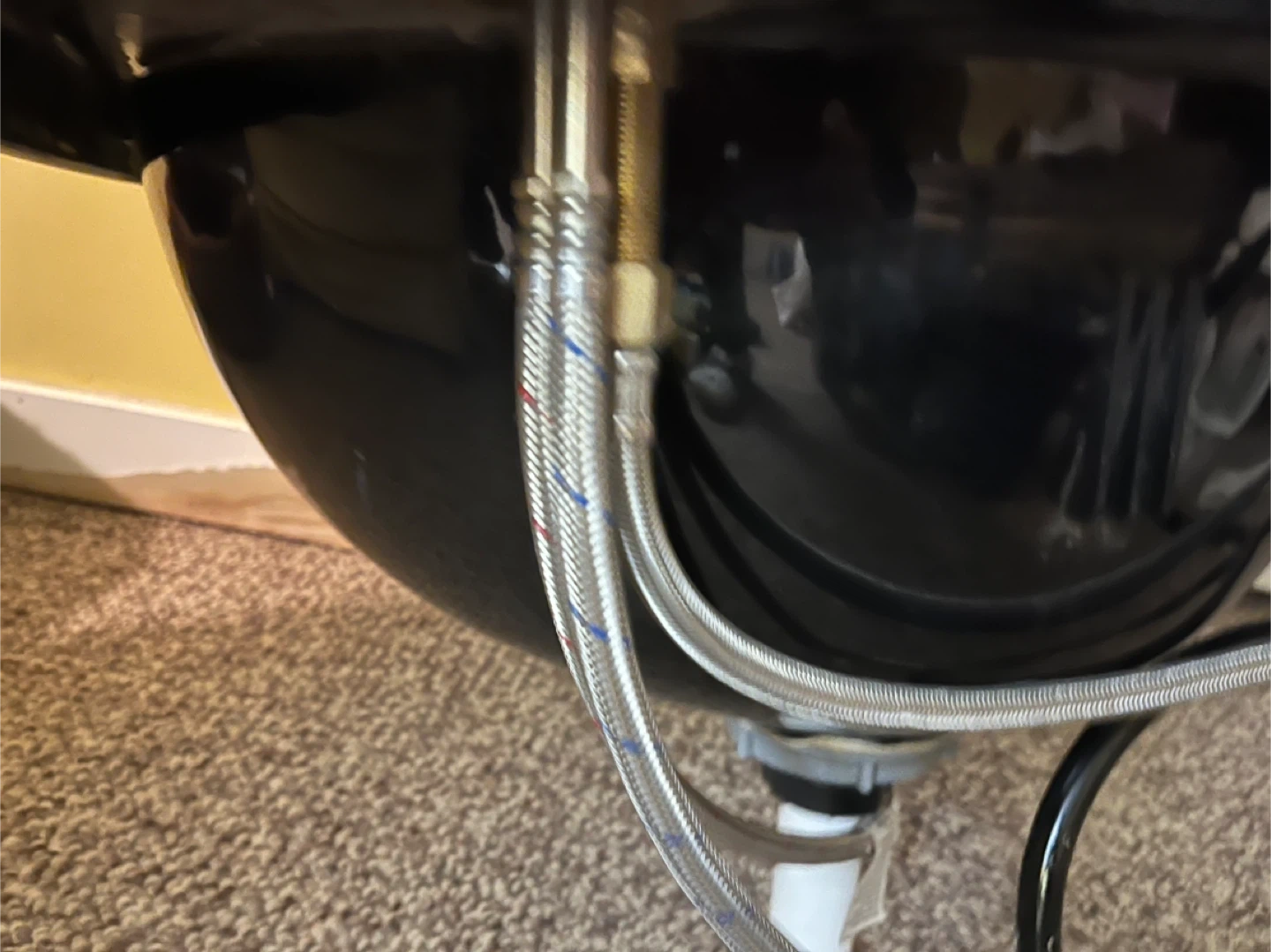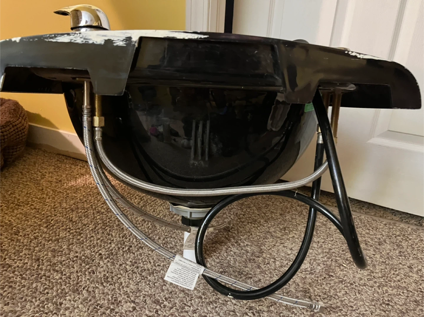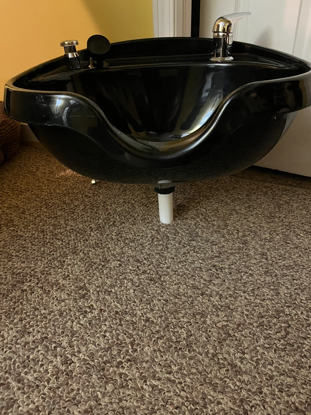 This is a black shampoo bowl with faucet connections and a drain. It's made of a durable, glossy material. This bowl would be useful in a salon or barbershop setting.
