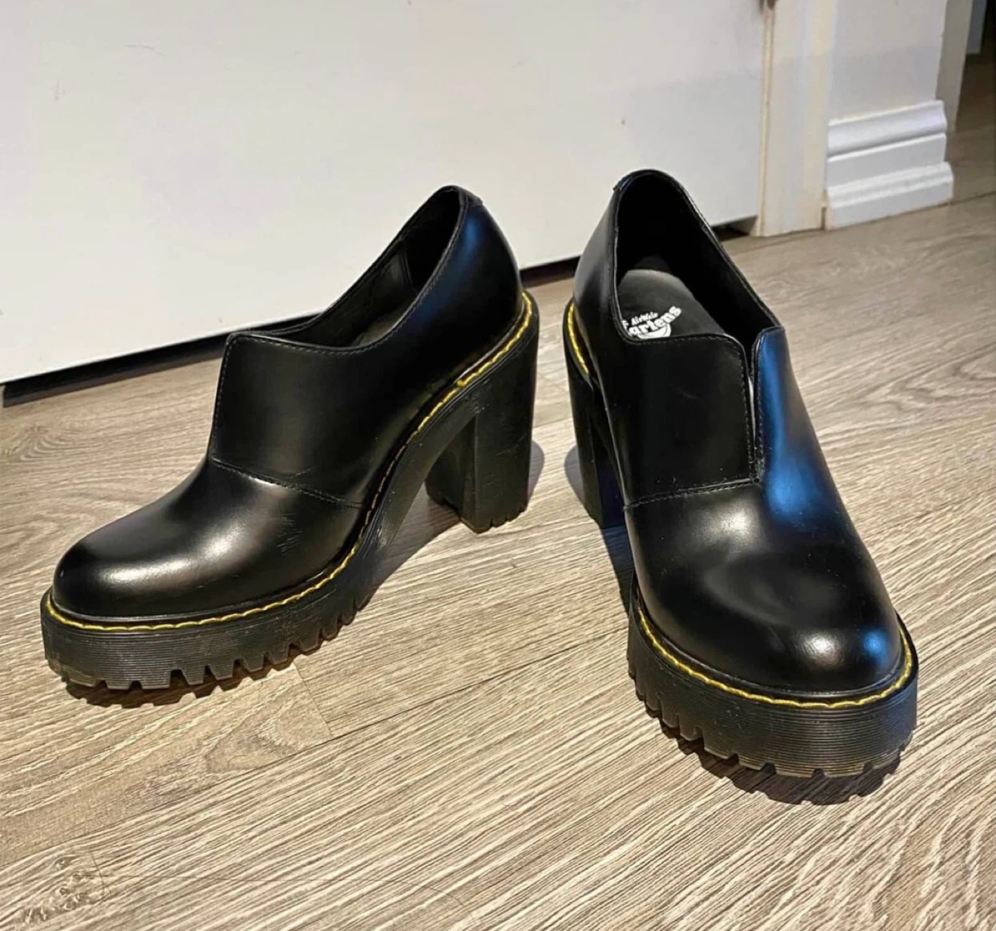 Dr. Martens Cordelia heels. Size 7. Platform sole and a chunky block heel with classic yellow stitching. Just bought off marketplace and sadly slightly too big for me! Maybe they’ll get the love and wear they deserve from you.
