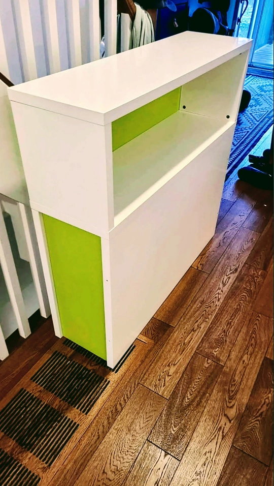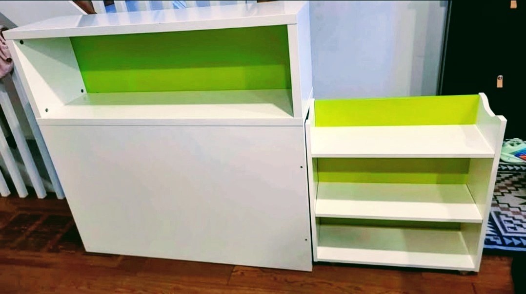 White and lime green IKEA Adult/Child's Twin Bed Headboard with Storage space. Two pieces, drawer on side rolls out on wheels for extra storage. One tall unit with shelf and one shorter two-shelf unit. Great condition. Fully assembled.