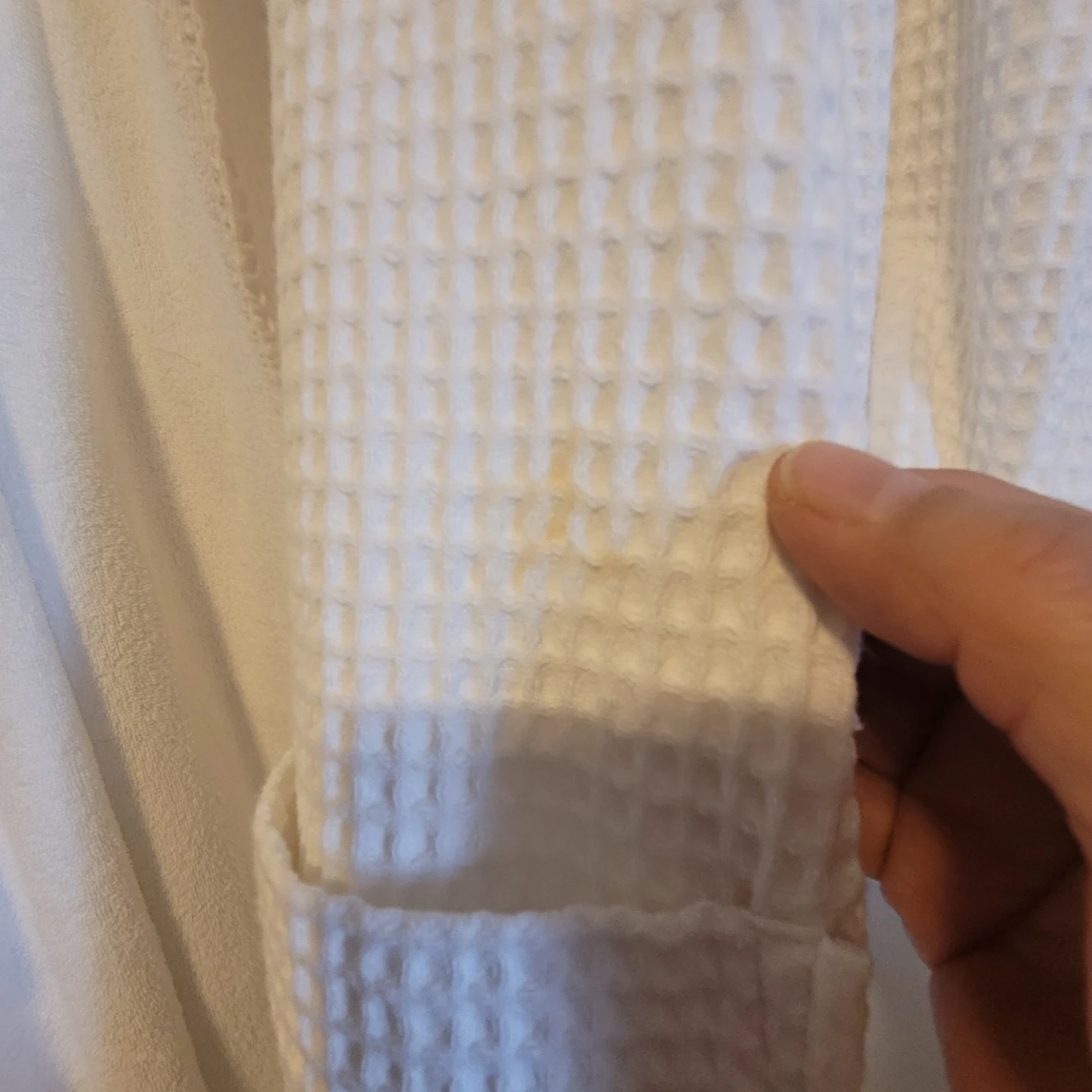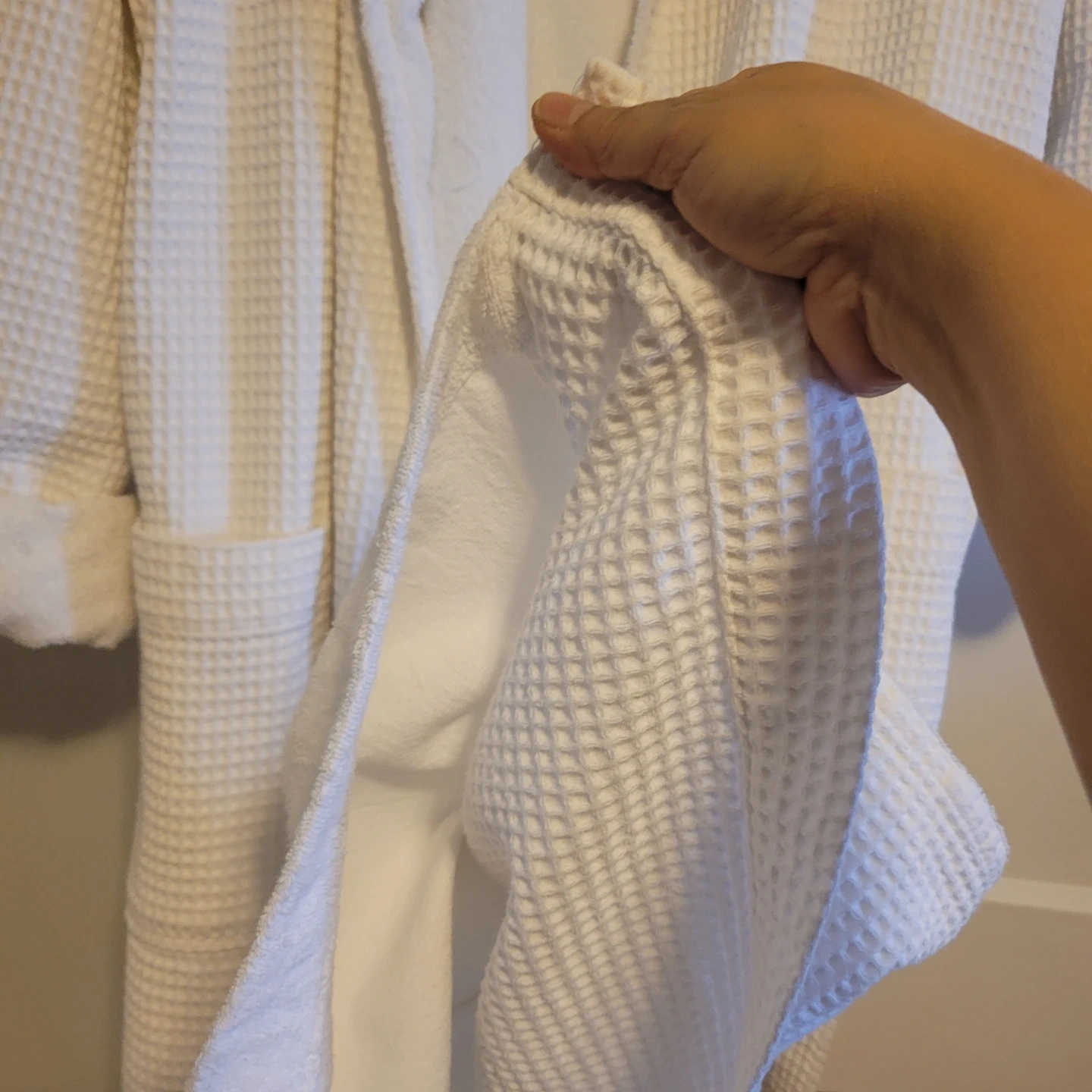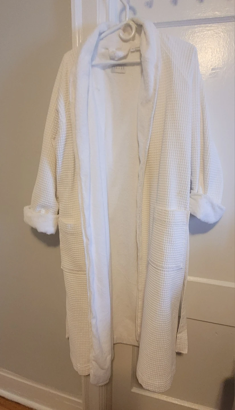 A luxurious white waffle terry bathrobe by Frette. Made in Turkey. Features a tie belt and two front pockets. It's a comfortable and stylish robe for lounging or after a bath.