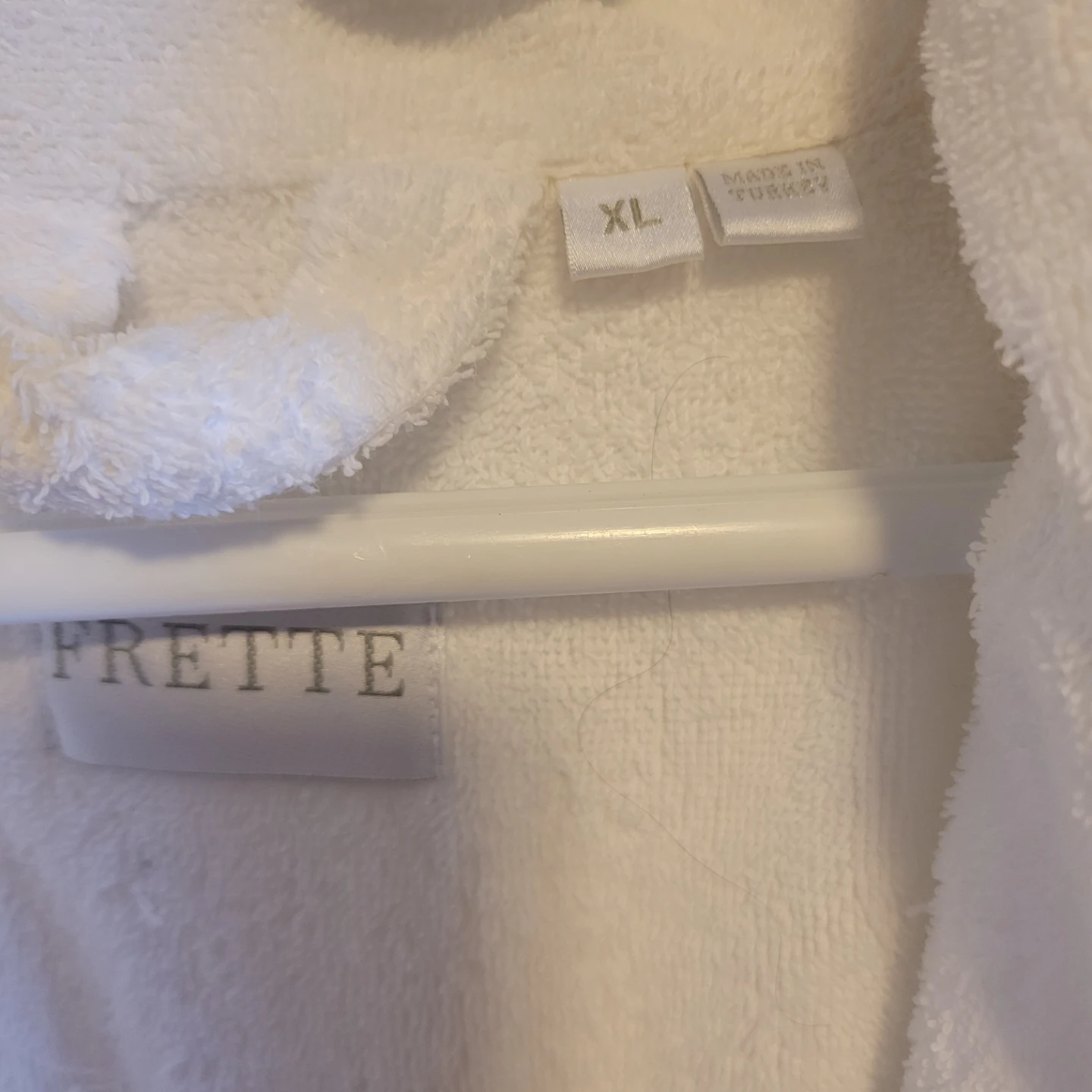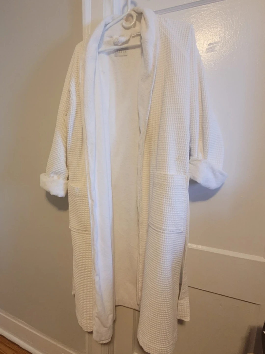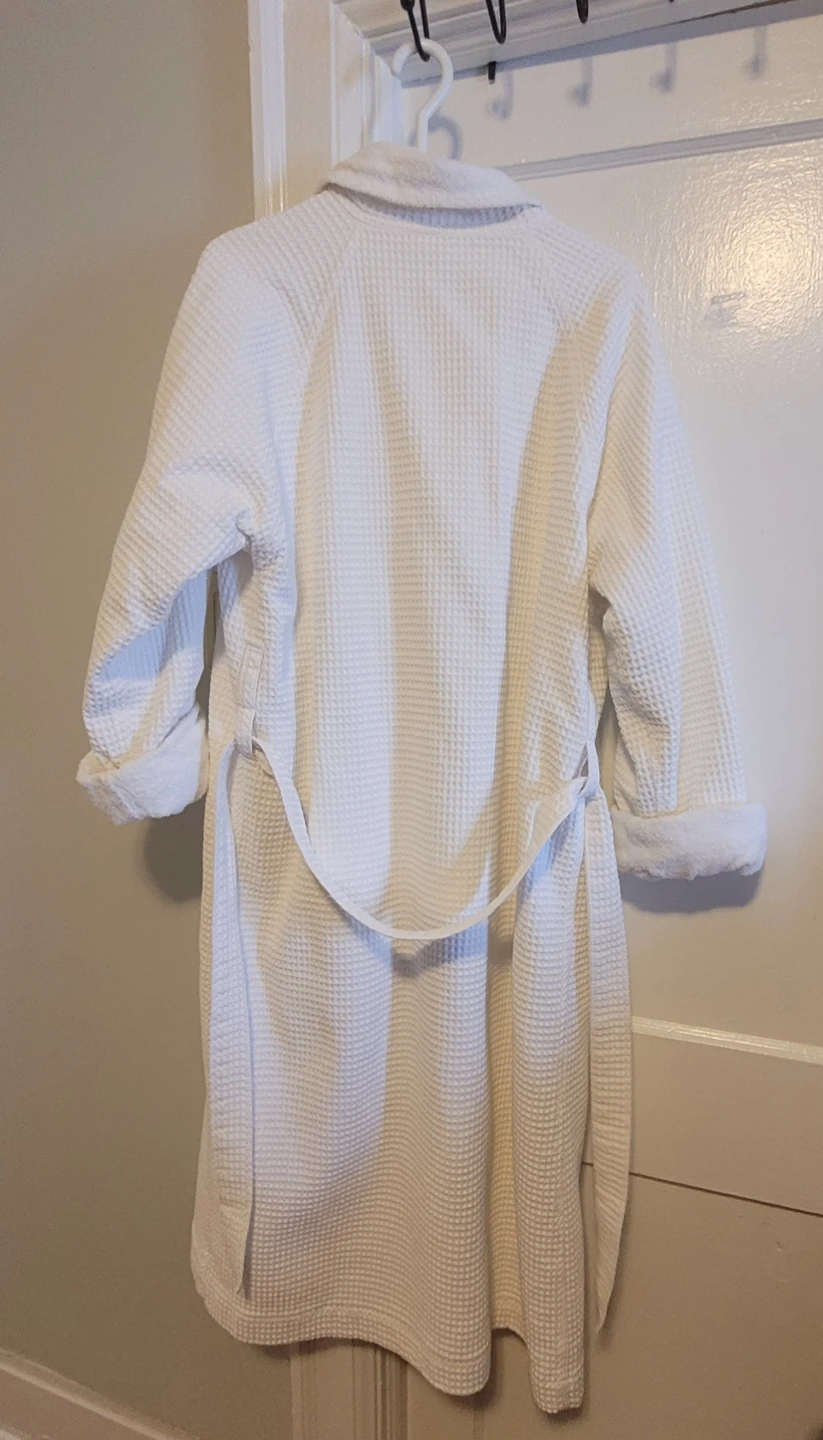A luxurious white waffle terry bathrobe by Frette. Made in Turkey. Features a tie belt and two front pockets. It's a comfortable and stylish robe for lounging or after a bath.