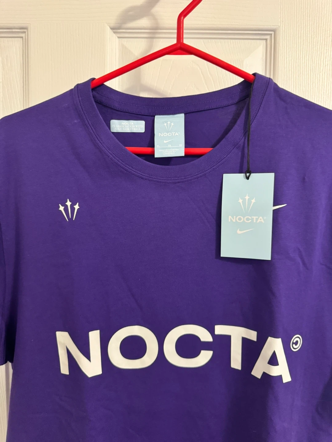 This is a brand new Nike NOCTA T-shirt in purple, size XL! The shirt features the NOCTA logo on the front and a unique design on the back. It's in perfect condition, never worn and ready for a new owner