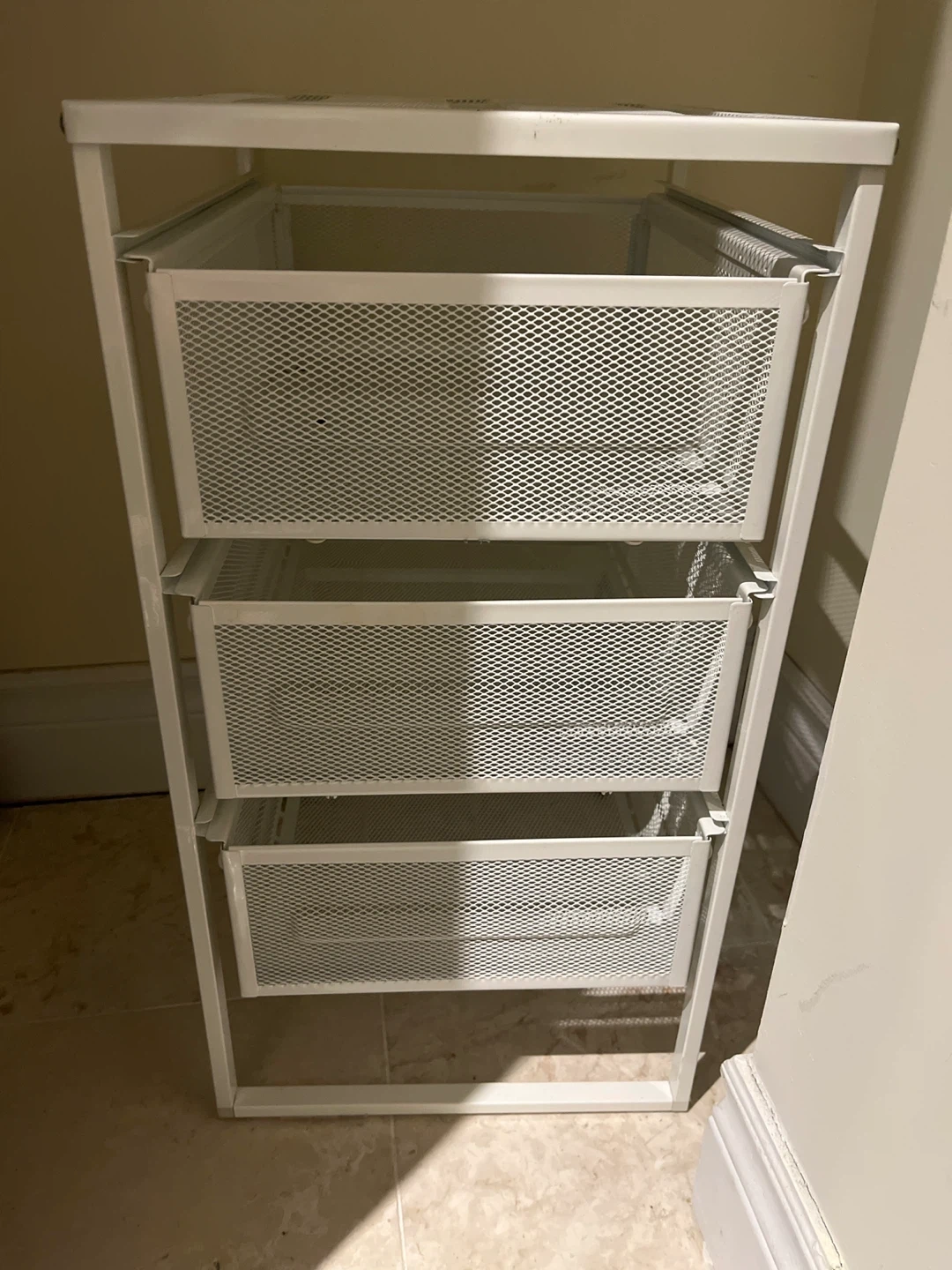White metal mesh rolling cart with three drawers. It's great for organizing small items. This cart is perfect for a craft room or small apartment storage!