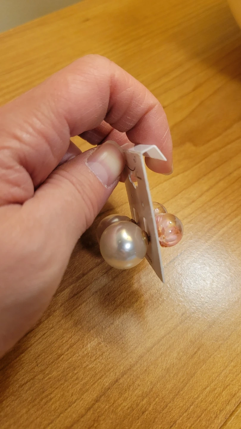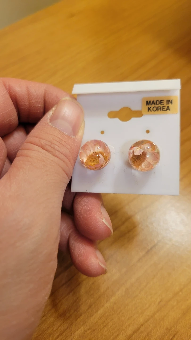 This earrings has a pair of faux pearl stud on one end and a pair of floral resin stud on the other end. Two different styles in one pair of earrings. It is made in Korea. They're perfect for adding a touch of elegance or a pop of colour to any outfit!