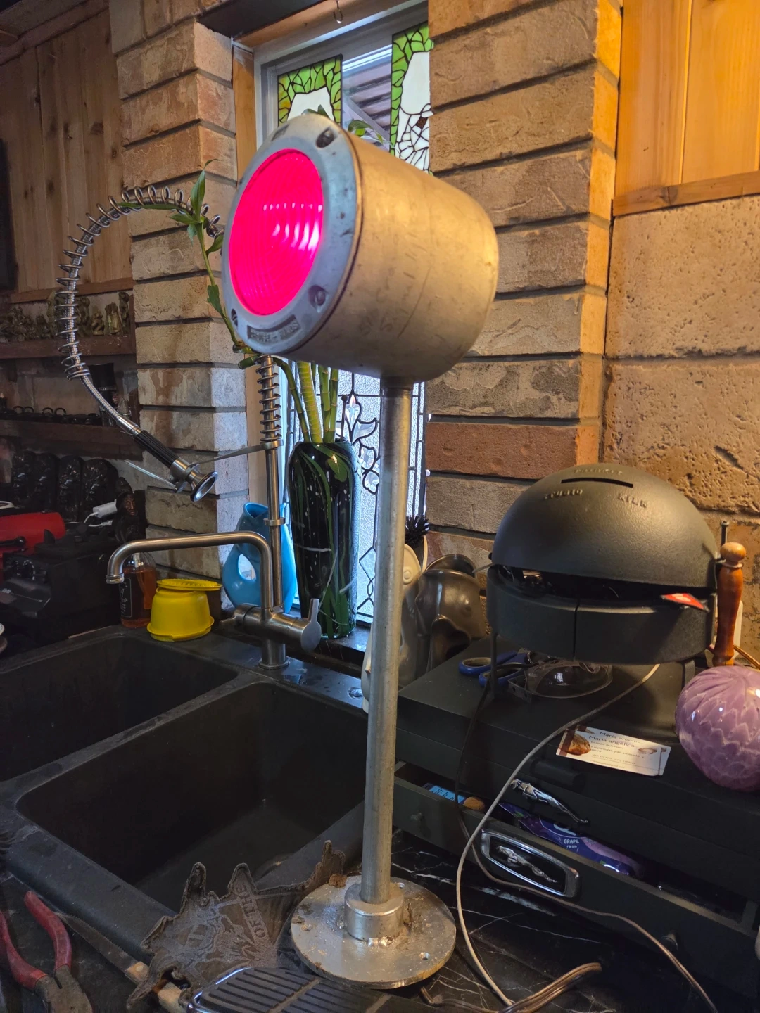 This is a unique, vintage signal light lamp It features a distinctive red lens and a sturdy metal stand. This piece would make a great addition for any collector or as a unique decor item!